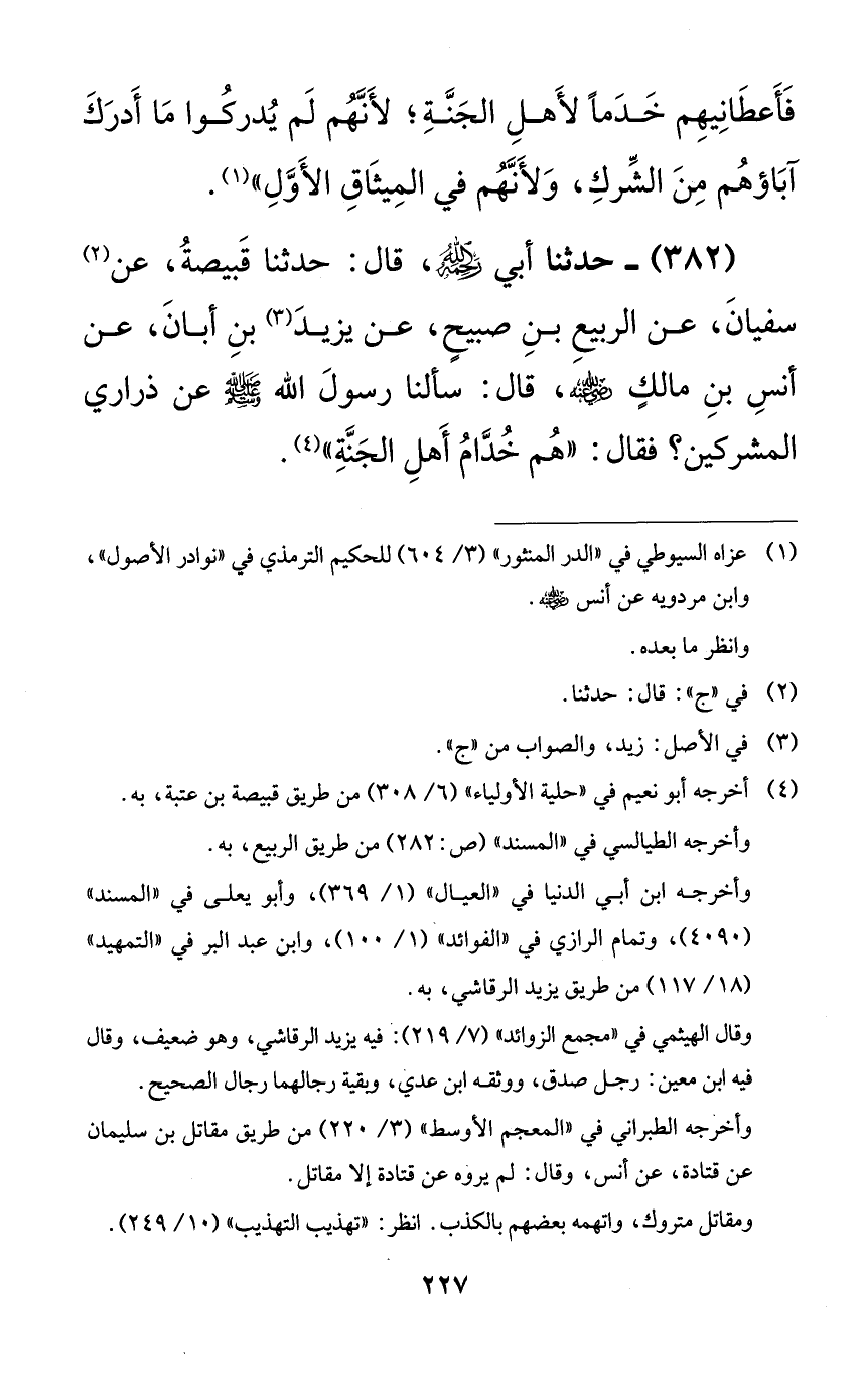 382 - حدثنا أبي رحمه الله، قال: حدثنا قبيصة، عن سفيان، عن الربيع بن صبيحٍ، عن يزيد بن أبان، عن أنس بن مالكٍ رضي الله عنه، قال: سألنا رسول الله صلى الله عليه وسلم عن ذراري المشركين؟ فقال: ((هم خدام أهل الجنة)).