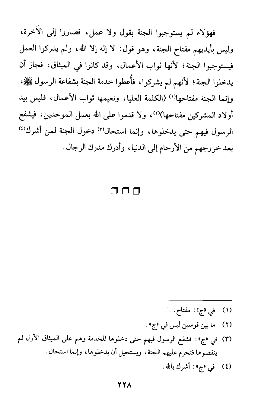 فهؤلاء لم يستوجبوا الجنة بقول ولا عمل، فصاروا إلى الآخرة، وليس بأيديهم مفتاح الجنة، وهو قول: لا إله إلا الله، ولم يدركوا العمل فيستوجبوا الجنة؛ لأنها ثواب الأعمال، وقد كانوا في الميثاق، فجاز أن يدخلوا الجنة؛ لأنهم لم يشركوا، فأعطوا خدمة الجنة بشفاعة الرسول صلى الله عليه وسلم، وإنما الجنة مفتاحها (الكلمة العليا، ونعيمها ثواب الأعمال، فليس بيد أولاد المشركين مفتاحها)، ولا قدموا على الله بعمل الموحدين، فيشفع الرسول فيهم حتى يدخلوها، وإنما استحال دخول الجنة لمن أشرك بعد خروجهم من الأرحام إلى الدنيا، وأدرك مدرك الرجال.
