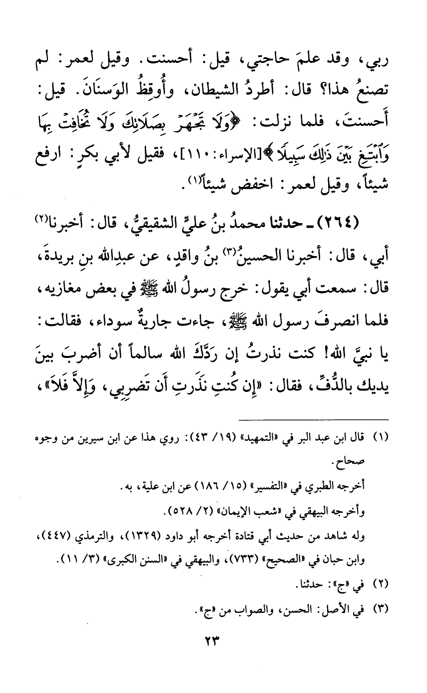 264 - حدثنا محمد بن علي الشقيقي، قال: أخبرنا أبي، قال: أخبرنا الحسين بن واقدٍ، عن عبد الله بن بريدة، قال: سمعت أبي يقول: خرج رسول الله صلى الله عليه وسلم في بعض مغازيه، فلما انصرف رسول الله صلى الله عليه وسلم، جاءت جاريةٌ سوداء، فقالت: يا نبي الله! كنت نذرت إن ردك الله سالماً أن أضرب بين يديك بالدف، فقال: ((إن كنت نذرت أن تضربي، وإلا فلا))،