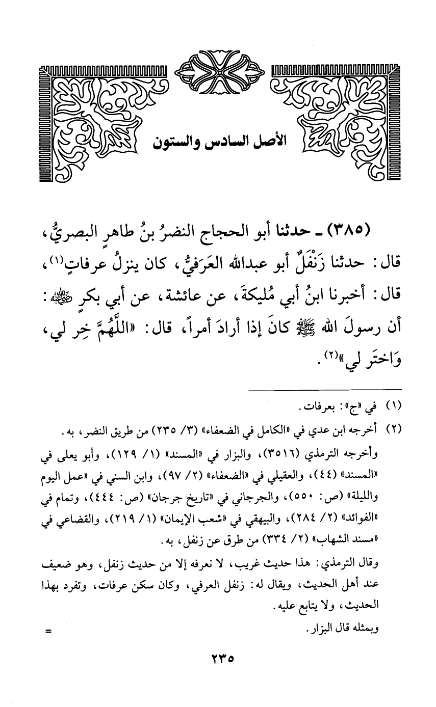 385 - حدثنا أبو الحجاج النضر بن طاهر البصري، قال: حدثنا زنفلٌ أبو عبد الله العرفي، كان ينزل عرفاتٍ، قال: أخبرنا ابن أبي مليكة، عن عائشة، عن أبي بكر رضي الله عنه: أن رسول الله صلى الله عليه وسلم كان إذا أراد أمراً، قال: ((اللهم خر لي، واختر لي)).