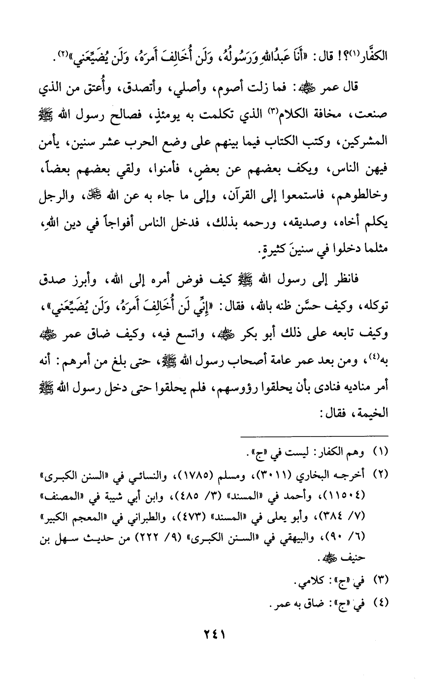 فانظر إلى رسول الله صلى الله عليه وسلم كيف فوض أمره إلى الله، وأبرز صدق توكله، وكيف حسن ظنه بالله، فقال: ((إني لن أخالف أمره، ولن يضيعني))، وكيف تابعه على ذلك أبو بكر رضي الله عنه، واتسع فيه، وكيف ضاق عمر رضي الله عنه به، ومن بعد عمر عامة أصحاب رسول الله صلى الله عليه وسلم، حتى بلغ من أمرهم: أنه أمر مناديه فنادى بأن يحلقوا رؤوسهم، فلم يحلقوا حتى دخل رسول الله صلى الله عليه وسلم الخيمة، فقال: