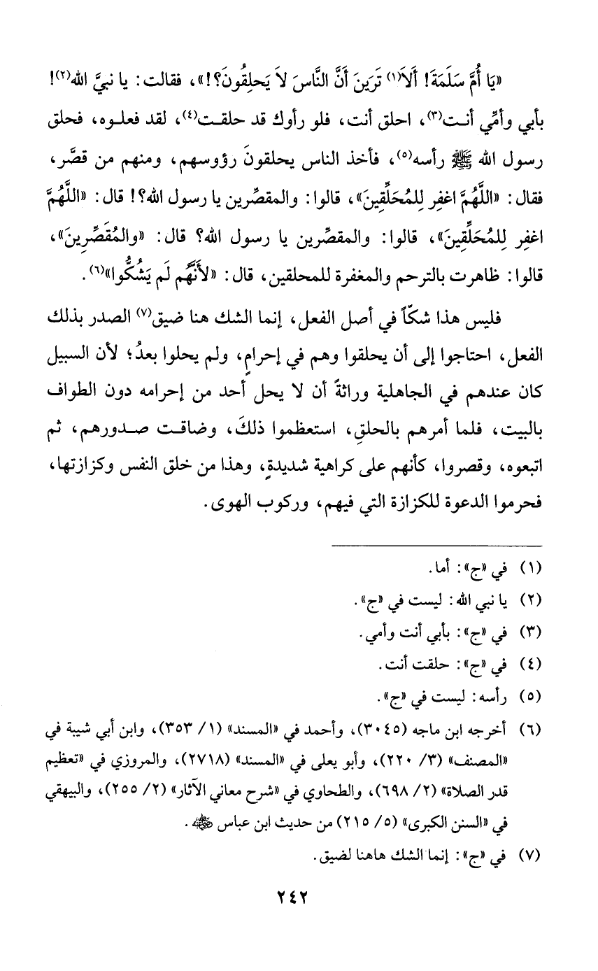 ((يا أم سلمة! ألا ترين أن الناس لا يحلقون؟!))، فقالت: يا نبي الله! بأبي وأمي أنت، احلق أنت، فلو رأوك قد حلقت، لقد فعلوه، فحلق رسول الله صلى الله عليه وسلم رأسه، فأخذ الناس يحلقون رؤوسهم، ومنهم من قصر، فقال: ((اللهم اغفر للمحلقين))، قالوا: والمقصرين يا رسول الله؟ قال: ((اللهم اغفر للمحلقين))، قالوا: والمقصرين يا رسول الله؟ قال: ((والمقصرين))، قالوا: ظاهرت بالترحم والمغفرة للمحلقين، قال: ((لأنهم لم يشكوا)).