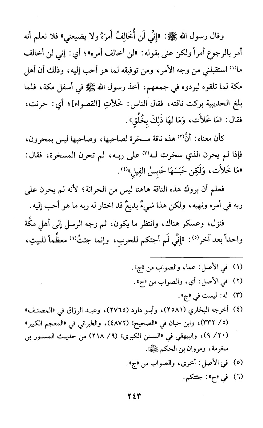 وقال رسول الله صلى الله عليه وسلم: ((إني لن أخالف أمره ولا يضيعني)) فلا نعلم أنه أمر بالرجوع أمراً ولكن عنى بقوله: ((لن أخالف أمره))؛ أي: إني لن أخالف ما استقبلني من وجه الأمر، ومن توفيقه لما هو أحب إليه، وذلك أن أهل مكة لما تلقوه ليردوه في جمعهم، أخذ رسول الله صلى الله عليه وسلم في أسفل مكة، فلما بلغ الحديبية بركت ناقته، فقال الناس: خلأت [القصواء]؛ أي: حرنت، فقال: ((ما خلأت، وما لها ذلك بخلقٍ)).