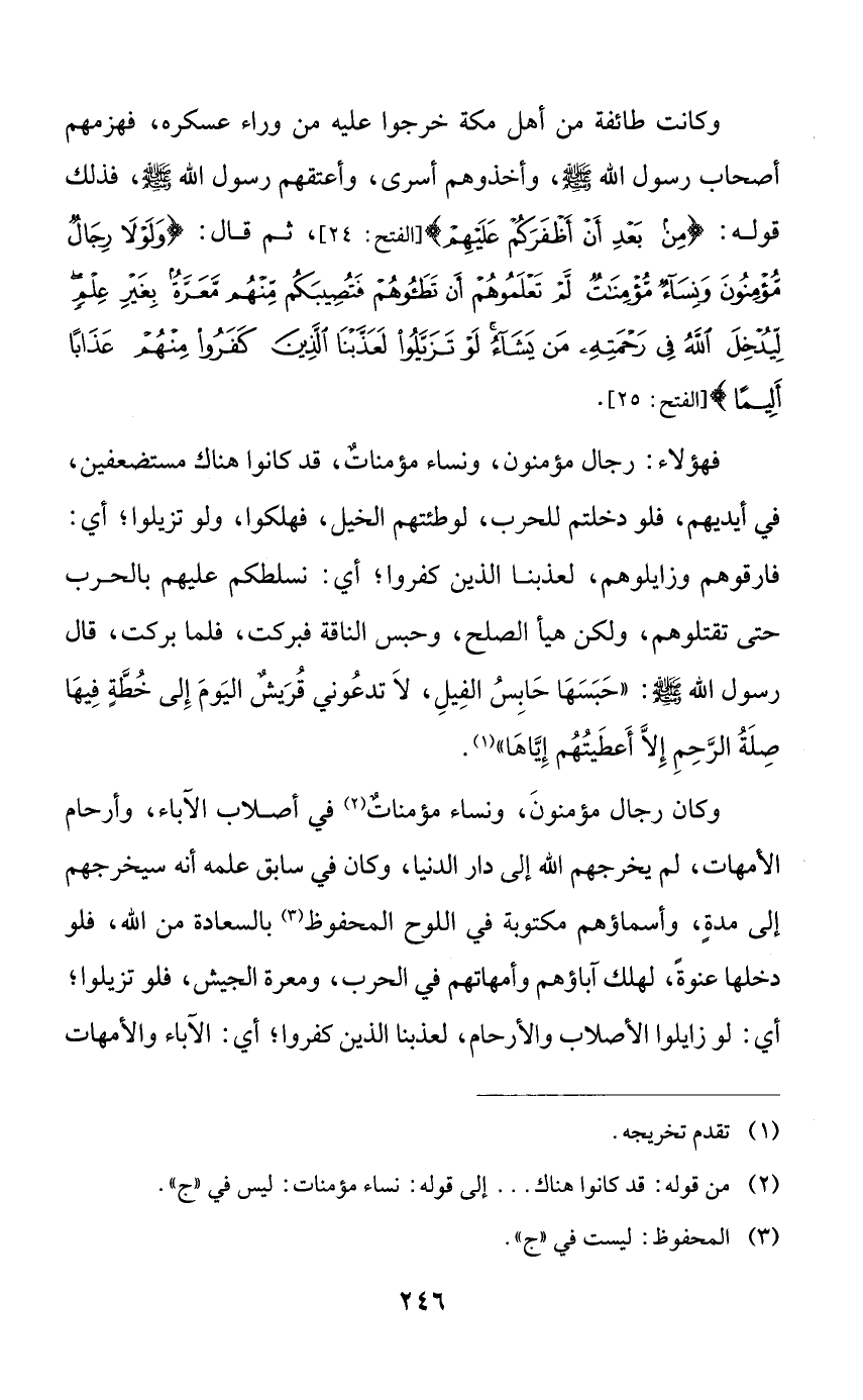 فهؤلاء: رجال مؤمنون، ونساء مؤمناتٌ، قد كانوا هناك مستضعفين، في أيديهم، فلو دخلتم للحرب، لوطئتهم الخيل، فهلكوا، ولو تزيلوا؛ أي: فارقوهم وزايلوهم، لعذبنا الذين كفروا؛ أي: نسلطكم عليهم بالحرب حتى تقتلوهم، ولكن هيأ الصلح، وحبس الناقة فبركت، فلما بركت، قال رسول الله صلى الله عليه وسلم: ((حبسها حابس الفيل، لا تدعوني قريشٌ اليوم إلى خطةٍ فيها صلة الرحم إلا أعطيتهم إياها)).