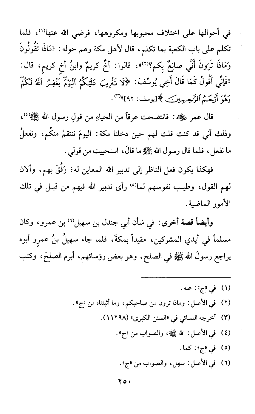 في أحوالها على اختلاف محبوبها ومكروهها، فرضي الله عنها، فلما تكلم على باب الكعبة بما تكلم، قال لأهل مكة وهم حوله: ((ماذا تقولون وماذا ترون أني صانعٌ بكم؟))، قالوا: أخٌ كريمٌ وابن أخٍ كريمٍ، قال: ((فإني أقول كما قال أخي يوسف: {لا تثريب عليكم اليوم يغفر الله لكم وهو أرحم الراحمين})).