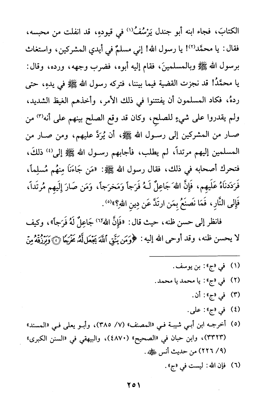 الكتاب، فجاء ابنه أبو جندل يرسف في قيوده، قد انفلت من محبسه، فقال: يا محمد! يا رسول الله! إني مسلمٌ في أيدي المشركين، واستغاث برسول الله صلى الله عليه وسلم وبالمسلمين، فقام إليه أبوه، فضرب وجهه، ورده، وقال: يا محمد! قد نجزت القضية فيما بيننا، فتركه رسول الله صلى الله عليه وسلم في يده، حتى رده، فكاد المسلمون أن يفتتنوا في ذلك الأمر، وأخذهم الغيظ الشديد، ولم يقدروا على شيءٍ للصلح، وكان قد وقع الصلح بينهم على أنه من صار من المشركين إلى رسول الله صلى الله عليه وسلم، أن يرد عليهم، ومن صار من المسلمين إليهم مرتداً، لم يطلب، فأجابهم رسول الله صلى الله عليه وسلم إلى ذلك، فتحرك أصحابه في ذلك، فقال رسول الله صلى الله عليه وسلم: ((من جاءنا منهم مسلماً، فرددناه عليهم، فإن الله جاعلٌ له فرجاً ومخرجاً، ومن صار إليهم مرتداً، فإلى النار، فما نصنع بمن ارتد عن دين الله؟)).
