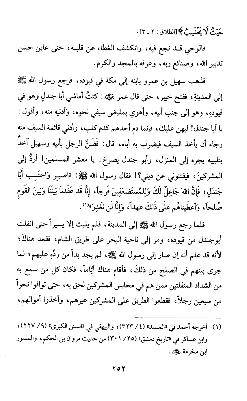 فذهب سهيل بن عمرو بابنه إلى مكة في قيوده، فرجع رسول الله صلى الله عليه وسلم إلى المدينة، ففتح خيبر، حتى قال عمر رضي الله عنه: كنت أماشي أبا جندلٍ وهو في قيوده، وهو إلى جنب أبيه، وأهوي بمقبض سيفي نحوه، وأدنيه منه، وأقول: يا أبا جندل! ليهن عليك، فإنما دم أحدهم كدم كلب، وأدني قائمة السيف منه رجاء أن يأخذ السيف فيضرب به أباه، قال: فضن الرجل بأبيه وسهيل آخذٌ بتلبيبه يجره إلى المنزل، وأبو جندل يصرخ: يا معشر المسلمين! أرد إلى المشركين، فيفتنوني عن ديني؟! فقال رسول الله صلى الله عليه وسلم: ((اصبر واحتسب أبا جندلٍ، فإن الله جاعلٌ لك وللمستضعفين فرجاً، إنا قد عقدنا بيننا وبين القوم صلحاً، وأعطيناهم على ذلك عهداً، وإنا لن نغدر)).