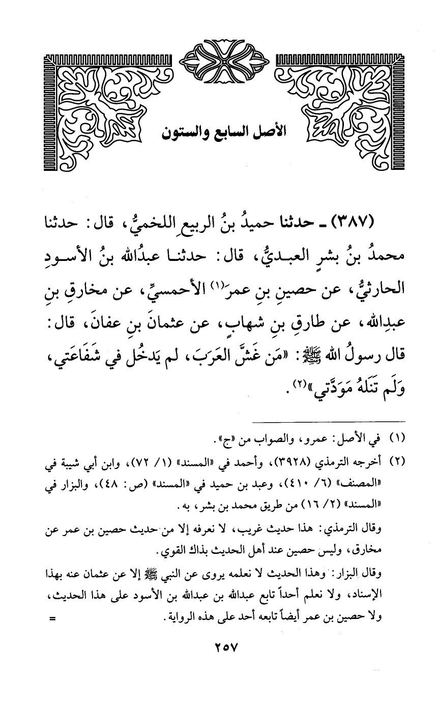 387 - حدثنا حميد بن الربيع اللخمي، قال: حدثنا محمد بن بشرٍ العبدي، قال: حدثنا عبد الله بن الأسود الحارثي، عن حصين بن عمر الأحمسي، عن مخارق بن عبد الله، عن طارق بن شهابٍ، عن عثمان بن عفان، قال: قال رسول الله صلى الله عليه وسلم: ((من غش العرب، لم يدخل في شفاعتي، ولم تنله مودتي)).