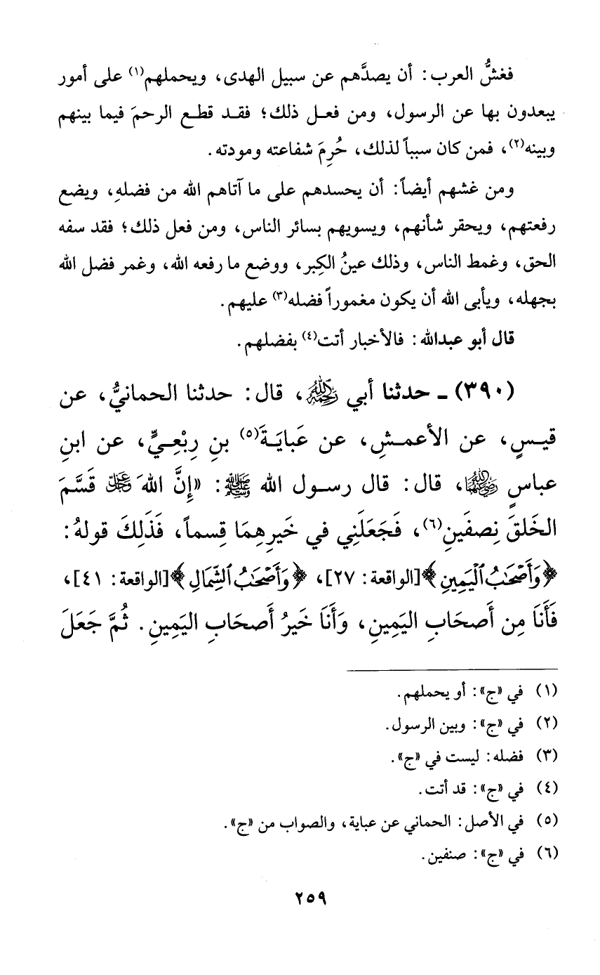 390 - حدثنا أبي رحمه الله، قال: حدثنا الحماني عن قيسٍ، عن الأعمش، عن عباية بن ربعي، عن ابن عباسٍ رضي الله عنهما، قال: قال رسول الله صلى الله عليه وسلم: ((إن الله عز وجل قسم الخلق نصفين، فجعلني في خيرهما قسماً، فذلك قوله: {وأصحاب اليمين}، {وأصحاب الشمال}، فأنا من أصحاب اليمين، وأنا خير أصحاب اليمين. ثم جعل