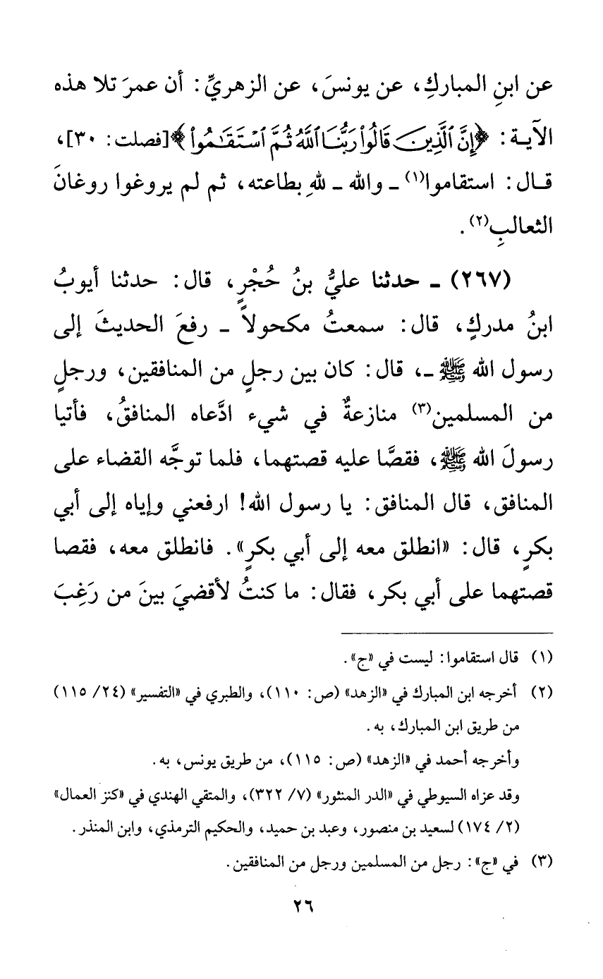 267 - حدثنا علي بن حجرٍ، قال: حدثنا أيوب ابن مدركٍ، قال: سمعت مكحولاً -رفع الحديث إلى رسول الله صلى الله عليه وسلم-، قال: كان بين رجلٍ من المنافقين، ورجلٍ من المسلمين منازعةٌ في شيء ادعاه المنافق، فأتيا رسول الله صلى الله عليه وسلم، فقصا عليه قصتهما، فلما توجه القضاء على المنافق، قال المنافق: يا رسول الله! ارفعني وإياه إلى أبي بكرٍ، قال: ((انطلق معه إلى أبي بكرٍ)). فانطلق معه، فقصا قصتهما على أبي بكر، فقال: ما كنت لأقضي بين من رغب