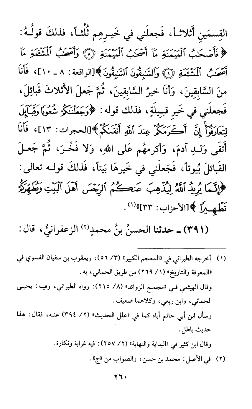 القسمين أثلاثاً، فجعلني في خيرهم ثلثاً، فذلك قوله: {فأصحاب الميمنة ما أصحاب الميمنة. وأصحاب المشئمة ما أصحاب المشئمة. والسابقون السابقون}، فأنا من السابقين، وأنا خير السابقين، ثم جعل الأثلاث قبائل، فجعلني في خير قبيلةٍ، فذلك قوله: {وجعلناكم شعوباً وقبائل لتعارفوا إن أكرمكم عند الله أتقاكم}، فأنا أتقى ولد آدم، وأكرمهم على الله، ولا فخر، ثم جعل القبائل بيوتاً، فجعلني في خيرها بيتاً، فذلك قوله تعالى: {إنما يريد ليذهب عنكم الرجس أهل البيت ويطهركم تطهيراً}.