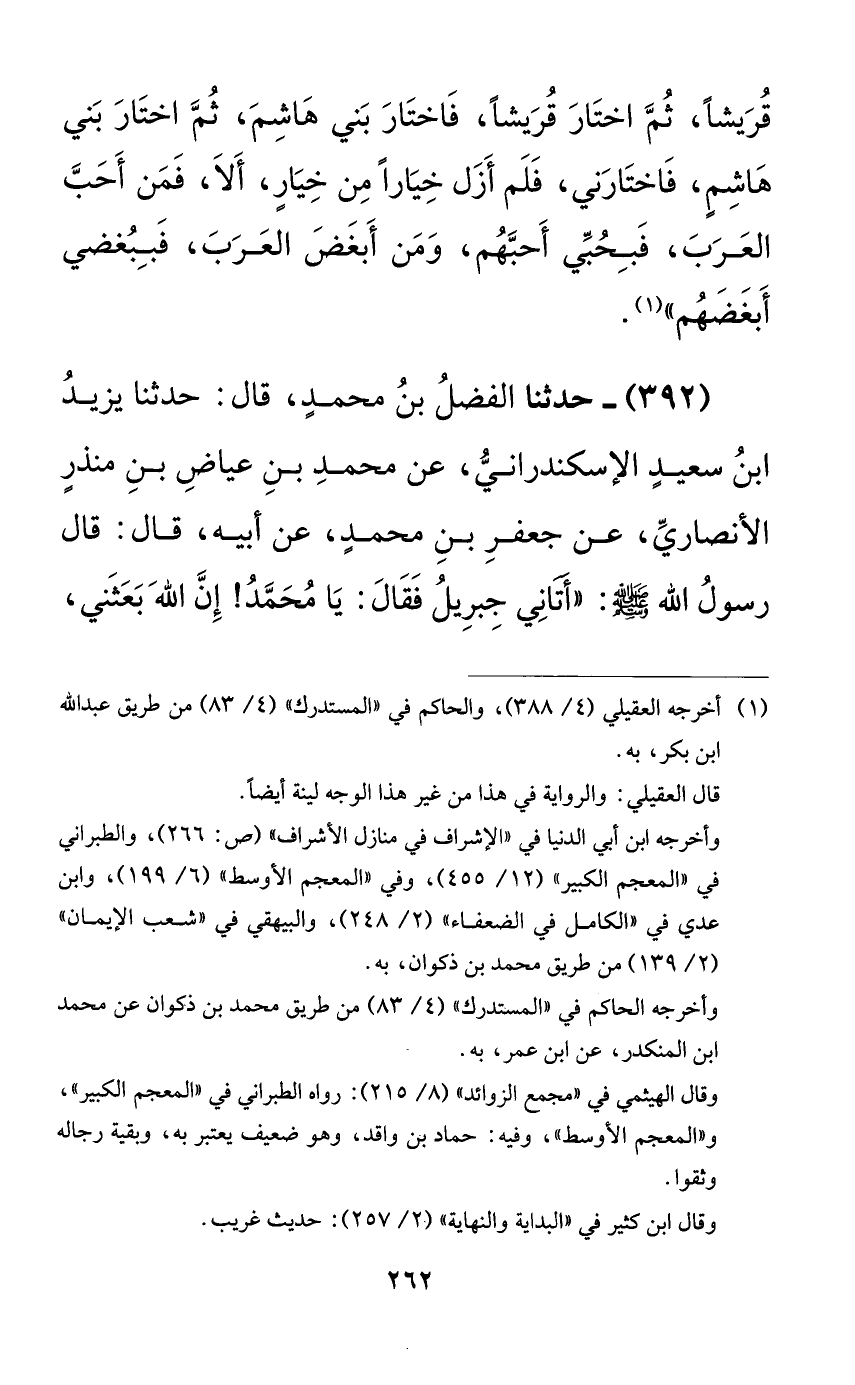 392 - حدثنا الفضل بن محمدٍ، قال: حدثنا يزيد ابن سعيدٍ الإسكندراني، عن محمد بن عياض بن منذرٍ الأنصاري، عن جعفر بن محمدٍ، عن أبيه، قال: قال رسول الله صلى الله عليه وسلم: ((أتاني جبريل فقال: يا محمد! إن الله بعثني،