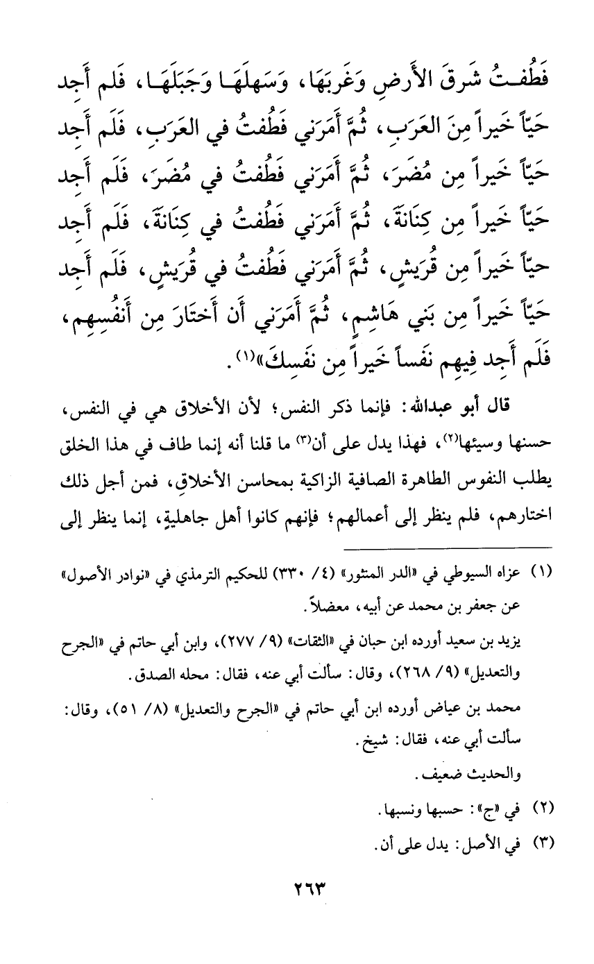 قال أبو عبد الله: فإنما ذكر النفس؛ لأن الأخلاق هي في النفس، حسنها وسيئها، فهذا يدل على أن ما قلنا أنه إنما طاف في هذا الخلق يطلب النفوس الطاهرة الصافية الزاكية بمحاسن الأخلاق، فمن أجل ذلك اختارهم، فلم ينظر إلى أعمالهم؛ فإنهم كانوا أهل جاهلية، إنما ينظر إلى