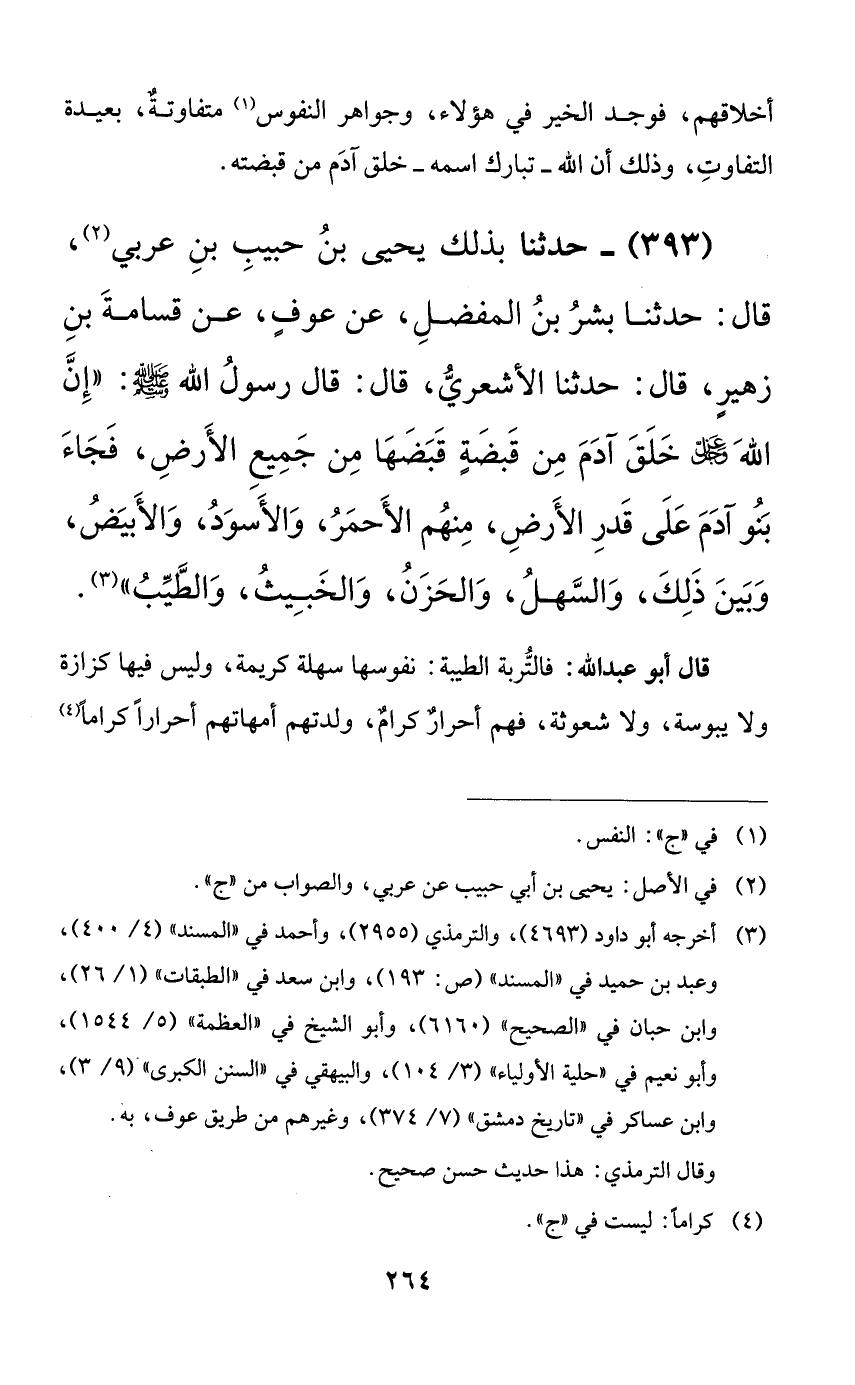 393 - حدثنا بذلك يحيى بن حبيب بن عربي، قال: حدثنا بشر بن المفضل، عن عوفٍ، عن قسامة بن زهيرٍ، قال: حدثنا الأشعري، قال: قال رسول الله صلى الله عليه وسلم: ((إن الله عز وجل خلق آدم من قبضةٍ قبضها من جميع الأرض، فجاء بنو آدم على قدر الأرض، منهم الأحمر، والأسود، والأبيض، وبين ذلك، والسهل، والحزن، والخبيث، والطيب)).