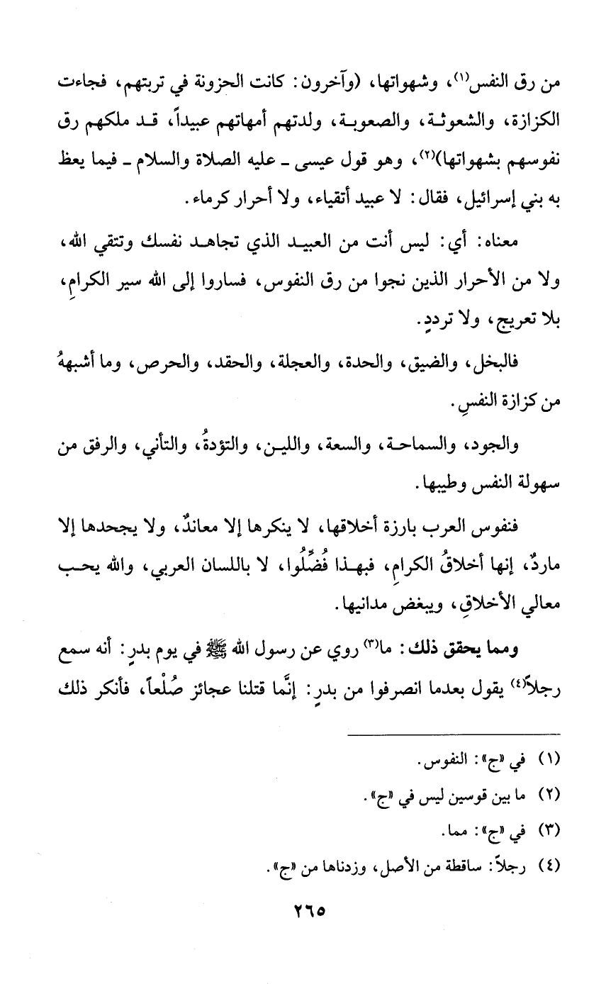من رق النفس، وشهواتها، (وآخرون: كانت الحزونة في تربتهم، فجاءت الكزازة، والشعوثة، والصعوبة، ولدتهم أمهاتهم عبيداً، قد ملكهم رق نفوسهم بشهواتها)، وهو قول عيسى -عليه الصلاة والسلام- فيما يعظ به بني إسرائيل، فقال: لا عبيد أتقياء، ولا أحرار كرماء.