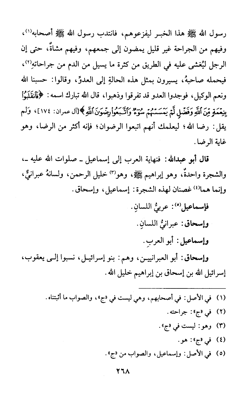 قال أبو عبد الله: فنهاية العرب إلى إسماعيل -صلوات الله عليه-، والشجرة واحدةٌ، وهو إبراهيم صلى الله عليه وسلم، وهو خليل الرحمن، ولسانه عبرانيٌّ، وإنما هما غصنان لهذه الشجرة: إسماعيل، وإسحاق.
