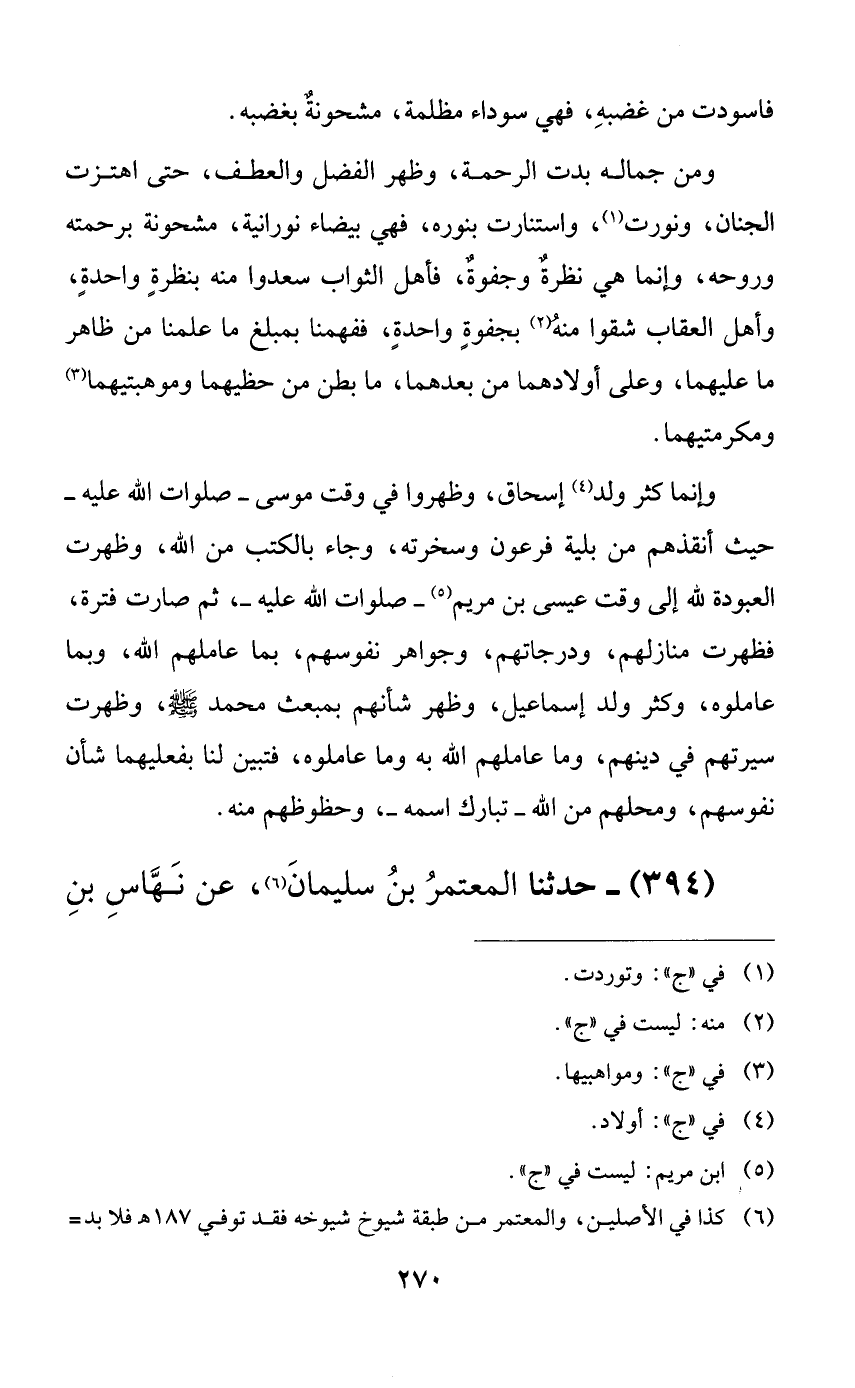 ومن جماله بدت الرحمة، وظهر الفضل والعطف، حتى اهتزت الجنان، ونورت، واستنارت بنوره، فهي بيضاء نورانية، مشحونة برحمته وروحه، وإنما هي نظرةٌ وجفوةٌ، فأهل الثواب سعدوا منه بنظرةٍ واحدةٍ، وأهل العقاب شقوا منه بجفوةٍ واحدةٍ، ففهمنا بمبلغ ما علمنا من ظاهر ما عليهما، وعلى أولادهما من بعدهما، ما بطن من حظيهما وموهبتيهما ومكرمتيهما.