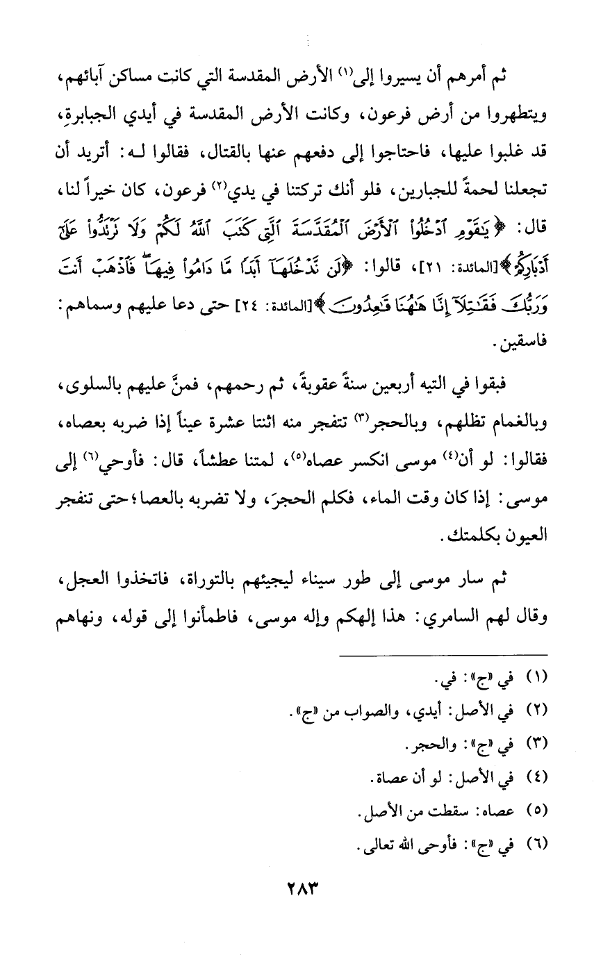 ثم أمرهم أن يسيروا إلى الأرض المقدسة التي كانت مساكن آبائهم، ويتطهروا من أرض فرعون، وكانت الأرض المقدسة في أيدي الجبابرة، قد غلبوا عليها، فاحتاجوا إلى دفعهم عنها بالقتال، فقالوا له: أتريد أن تجعلنا لحمةً للجبارين، فلو أنك تركتنا في يدي فرعون، كان خيراً لنا، قال: {يا قوم ادخلوا الأرض المقدسة التي كتب الله لكم ولا ترتدوا على أدباركم}، قالوا: {لن ندخلها أبداً ما داموا فيها فاذهب أنت وربك فقاتلا إنا ههنا قاعدون} حتى دعا عليهم وسماهم: فاسقين.