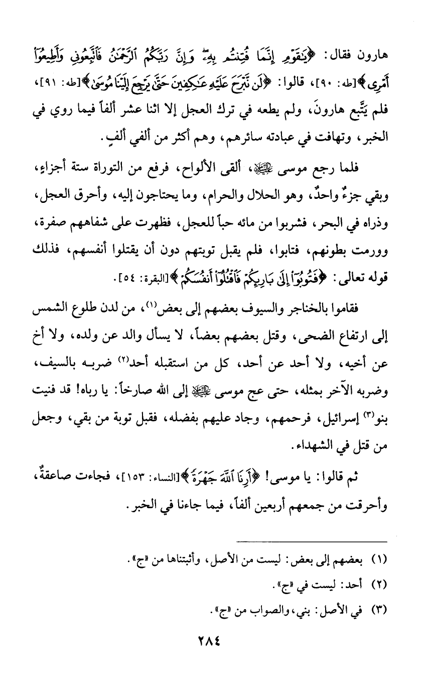 فقاموا بالخناجر والسيوف بعضهم إلى بعض، من لدن طلوع الشمس إلى ارتفاع الضحى، وقتل بعضهم بعضاً، لا يسأل والد عن ولده، ولا أخ عن أخيه، ولا أحد عن أحد، كل من استقبله أحد ضربه بالسيف، وضربه الآخر بمثله، حتى عج موسى عليه السلام إلى الله صارخاً: يا رباه! قد فنيت بنو إسرائيل، فرحمهم، وجاد عليهم بفضله، فقبل توبة من بقي، وجعل من قتل في الشهداء.
