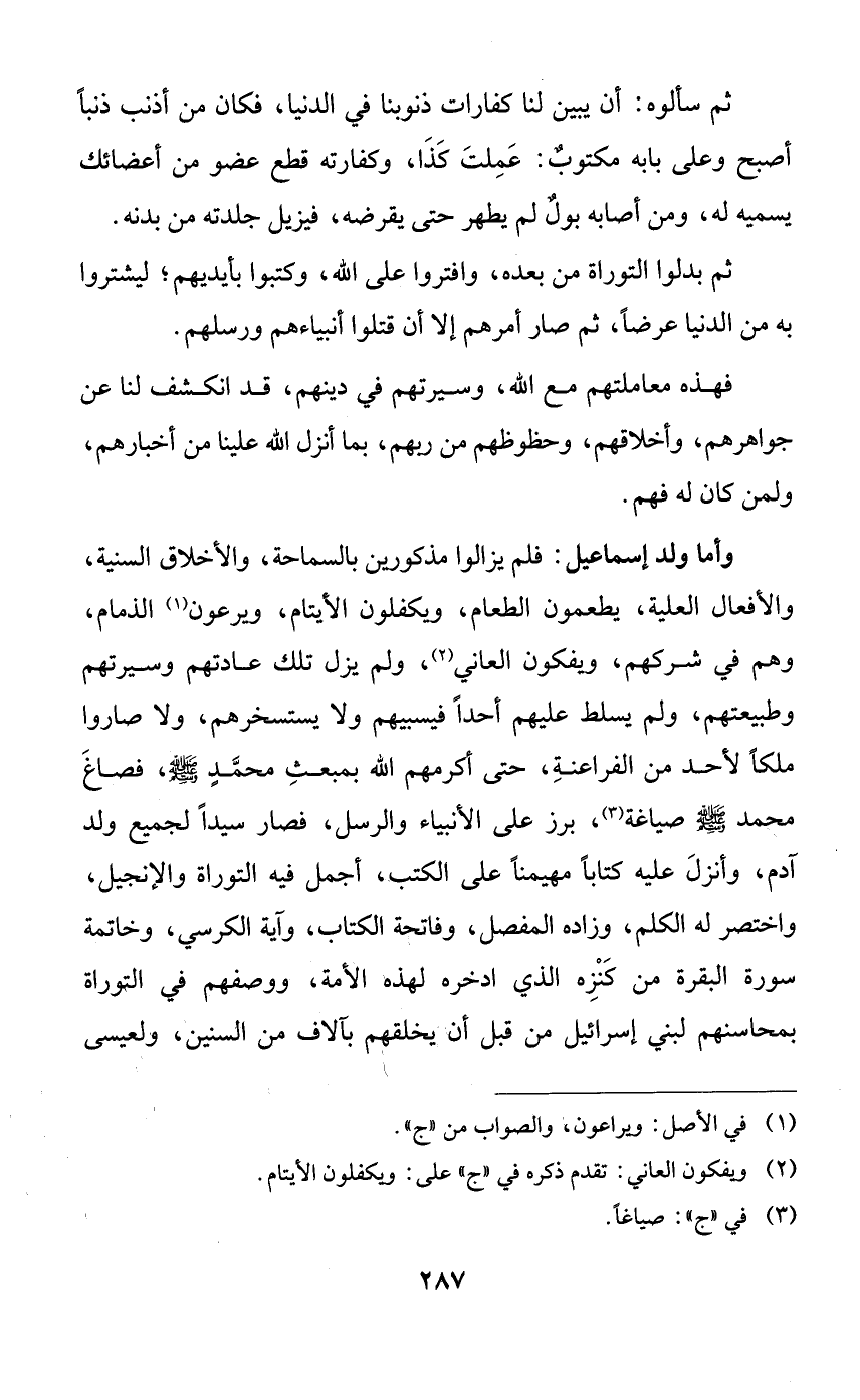 وأما ولد إسماعيل: فلم يزالوا مذكورين بالسماحة، والأخلاق السنية، والأفعال العلية، يطعمون الطعام، ويكفلون الأيتام، ويرعون الذمام، وهم في شركهم، ويفكون العاني، ولم يزل تلك عادتهم وسيرتهم وطبيعتهم، ولم يسلط عليهم أحداً فيسبيهم ولا يستسخرهم، ولا صاروا ملكاً لأحد من الفراعنة، حتى أكرمهم الله بمبعث محمدٍ صلى الله عليه وسلم، فصاغ محمد صلى الله عليه وسلم صياغة، برز على الأنبياء والرسل، فصار سيداً لجميع ولد آدم، وأنزل عليه كتاباً مهيمناً على الكتب، أجمل فيه التوراة والإنجيل، واختصر له الكلم، وزاده المفصل، وفاتحة الكتاب، وآية الكرسي، وخاتمة سورة البقرة من كنزه الذي ادخره لهذه الأمة، ووصفهم في التوراة بمحاسنهم لبني إسرائيل من قبل أن يخلقهم بآلاف من السنين، ولعيسى