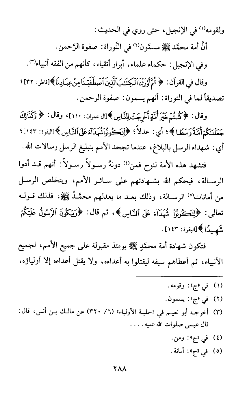 وقال: {كنتم خير أمةٍ أخرجت للناس}، وقال: {وكذلك جعلناكم أمةً وسطاً}؛ أي: عدلاً؛ {لتكونوا شهداء على الناس}؛ أي: شهداء الرسل بالبلاغ، عندما تجحد الأمم بتبليغ الرسل رسالات الله.