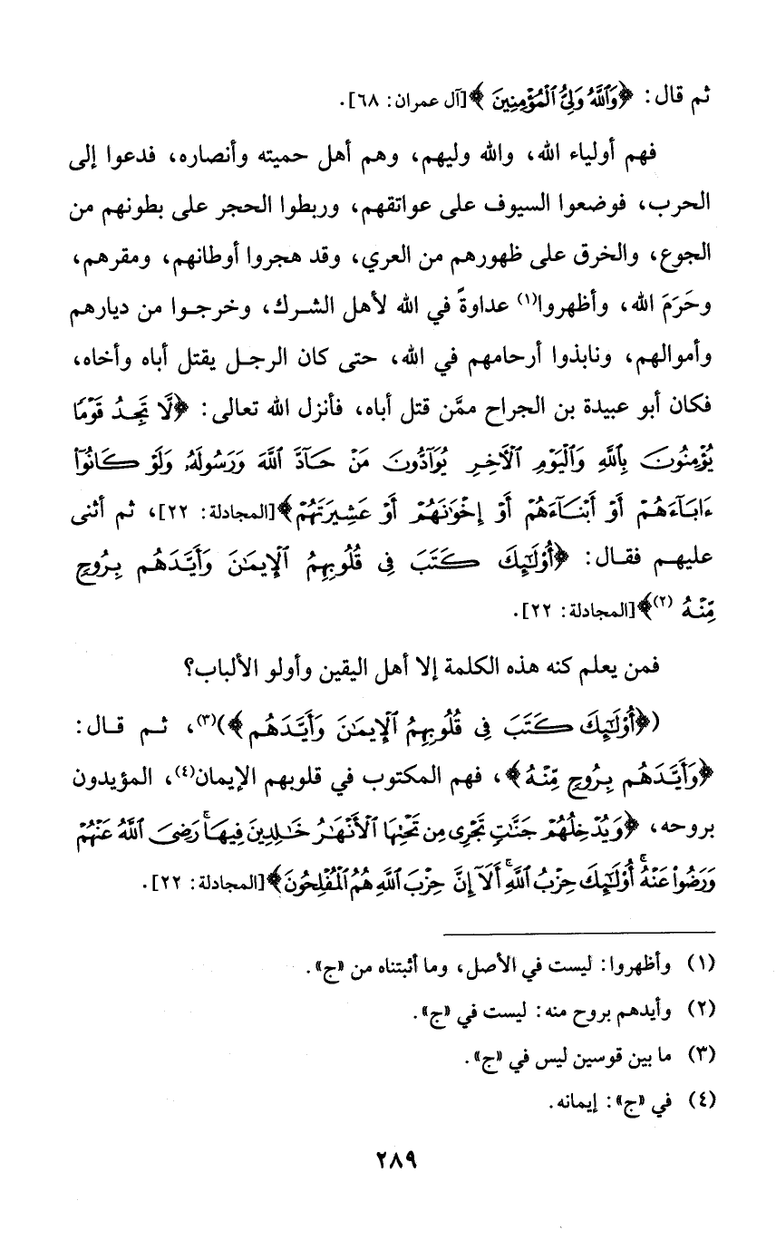 فهم أولياء الله، والله وليهم، وهم أهل حميته وأنصاره، فدعوا إلى الحرب، فوضعوا السيوف على عواتقهم، وربطوا الحجر على بطونهم من الجوع، والخرق على ظهورهم من العري، وقد هجروا أوطانهم، ومقرهم، وحرم الله، وأظهروا عداوةً في الله لأهل الشرك، وخرجوا من ديارهم وأموالهم، ونابذوا أرحامهم في الله، حتى كان الرجل يقتل أباه وأخاه، فكان أبو عبيدة بن الجراح ممن قتل أباه، فأنزل الله تعالى: {لا تجد قوماً يؤمنون بالله واليوم الآخر يوادون من حاد الله ورسوله ولو كانوا آباءهم أو أبناءهم أو إخوانهم أو عشيرتهم} ثم أثنى عليهم فقال: {أولئك كتب في قلوبهم الإيمان وأيدهم بروحٍ منه}.