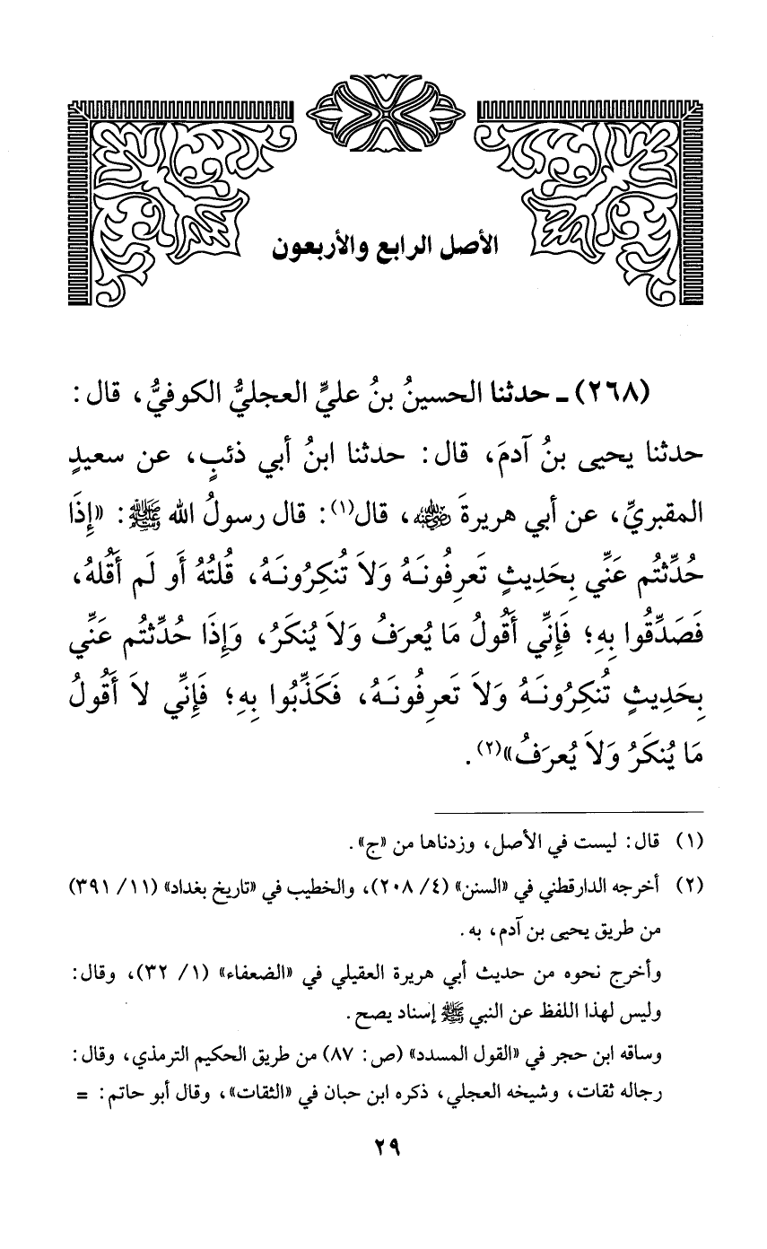 268 - حدثنا الحسين بن علي العجلي الكوفي، قال: حدثنا يحيى بن آدم، قال: حدثنا ابن أبي ذئبٍ، عن سعيدٍ المقبري، عن أبي هريرة رضي الله عنه، قال: قال رسول الله صلى الله عليه وسلم: ((إذا حدثتم عني بحديثٍ تعرفونه ولا تنكرونه، قلته أو لم أقله، فصدقوا به؛ فإني أقول ما يعرف ولا ينكر، وإذا حدثتم عني بحديثٍ تنكرونه ولا تعرفونه، فكذبوا به؛ فإني لا أقول ما ينكر ولا يعرف)).
