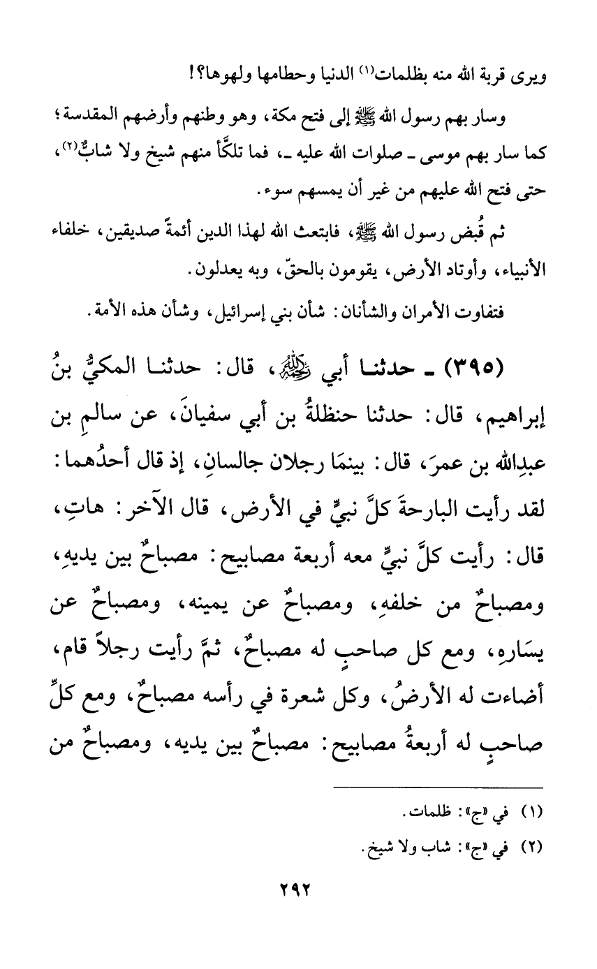 395 - حدثنا أبي رحمه الله، قال: حدثنا المكي بن إبراهيم، قال: حدثنا حنظلة بن أبي سفيان، عن سالم بن عبد الله بن عمر، قال: بينما رجلان جالسان، إذ قال أحدهما: لقد رأيت البارحة كل نبيٍّ في الأرض، قال الآخر: هات، قال: رأيت كل نبيٍّ معه أربعة مصابيح: مصباحٌ بين يديه، ومصباحٌ من خلفه، ومصباحٌ عن يمينه، ومصباحٌ عن يساره، ومع كل صاحبٍ له مصباحٌ، ثم رأيت رجلاً قام، أضاءت له الأرض، وكل شعرة في رأسه مصباحٌ، ومع كل صاحبٍ له أربعة مصابيح: مصباحٌ بين يديه، ومصباحٌ من
