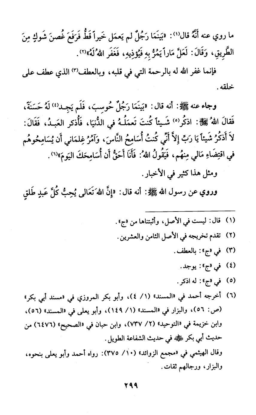 ما روي عنه أنه قال: ((بينما رجلٌ لم يعمل خيراً قط فرفع غصن شوكٍ من الطريق، وقال: لعل ماراً يمر به فيؤذيه، فغفر الله له)).