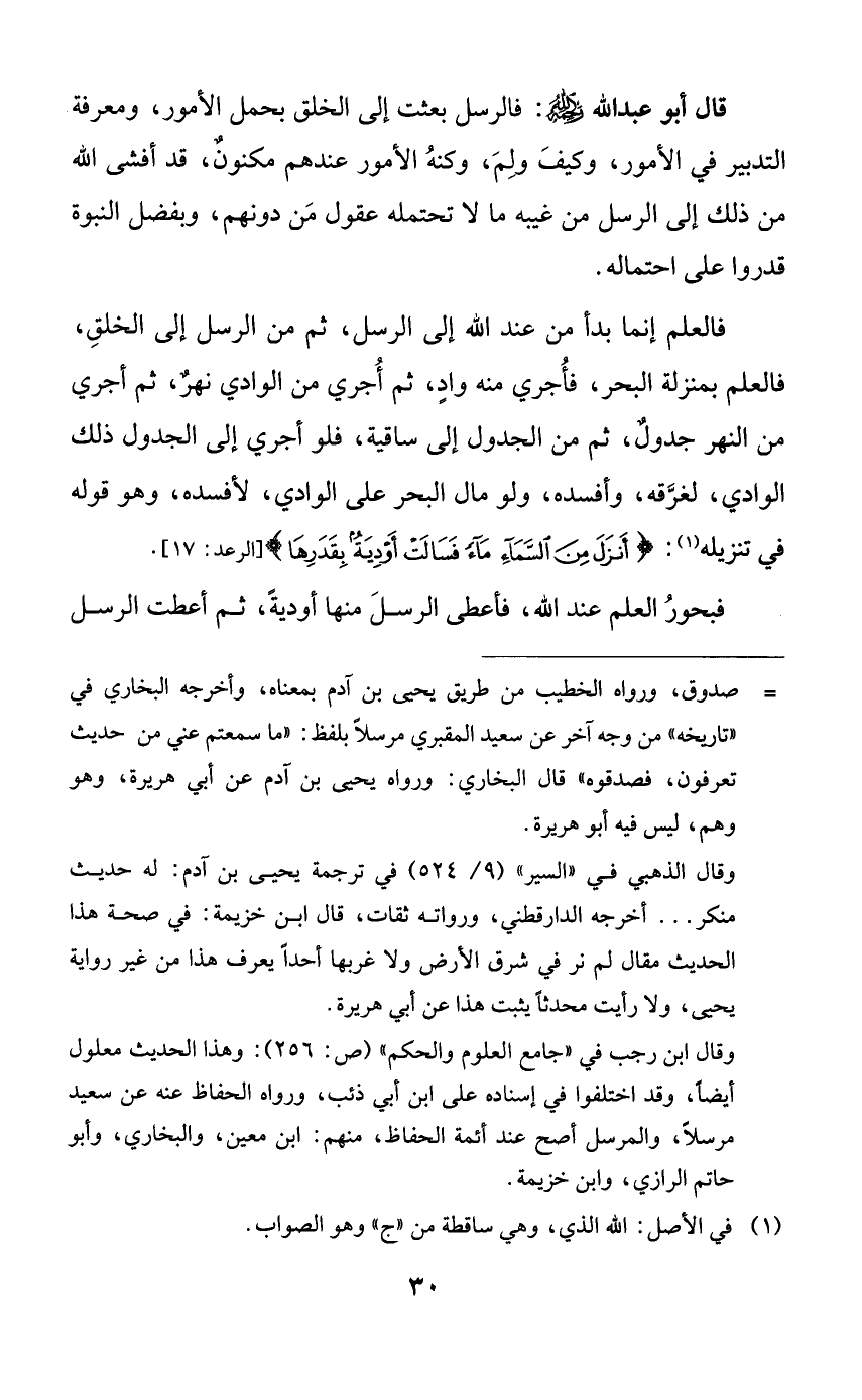 فالعلم إنما بدأ من عند الله إلى الرسل، ثم من الرسل إلى الخلق، فالعلم بمنزلة البحر، فأجري منه وادٍ، ثم أجري من الوادي نهرٌ، ثم أجري من النهر جدولٌ، ثم من الجدول إلى ساقية، فلو أجري إلى الجدول ذلك الوادي، لغرقه، وأفسده، ولو مال البحر على الوادي، لأفسده، وهو قوله في تنزيله: {أنزل من السماء ماءً فسالت أوديةٌ بقدرها}.