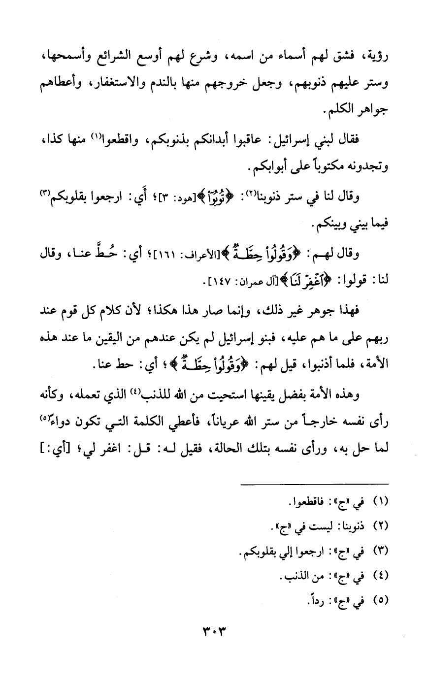فهذا جوهر غير ذلك، وإنما صار هذا هكذا؛ لأن كلام كل قوم عند ربهم على ما هم عليه، فبنو إسرائيل لم يكن عندهم من اليقين ما عند هذه الأمة، فلما أذنبوا، قيل لهم: {وقولوا حطةٌ}؛ أي: حط عنا.