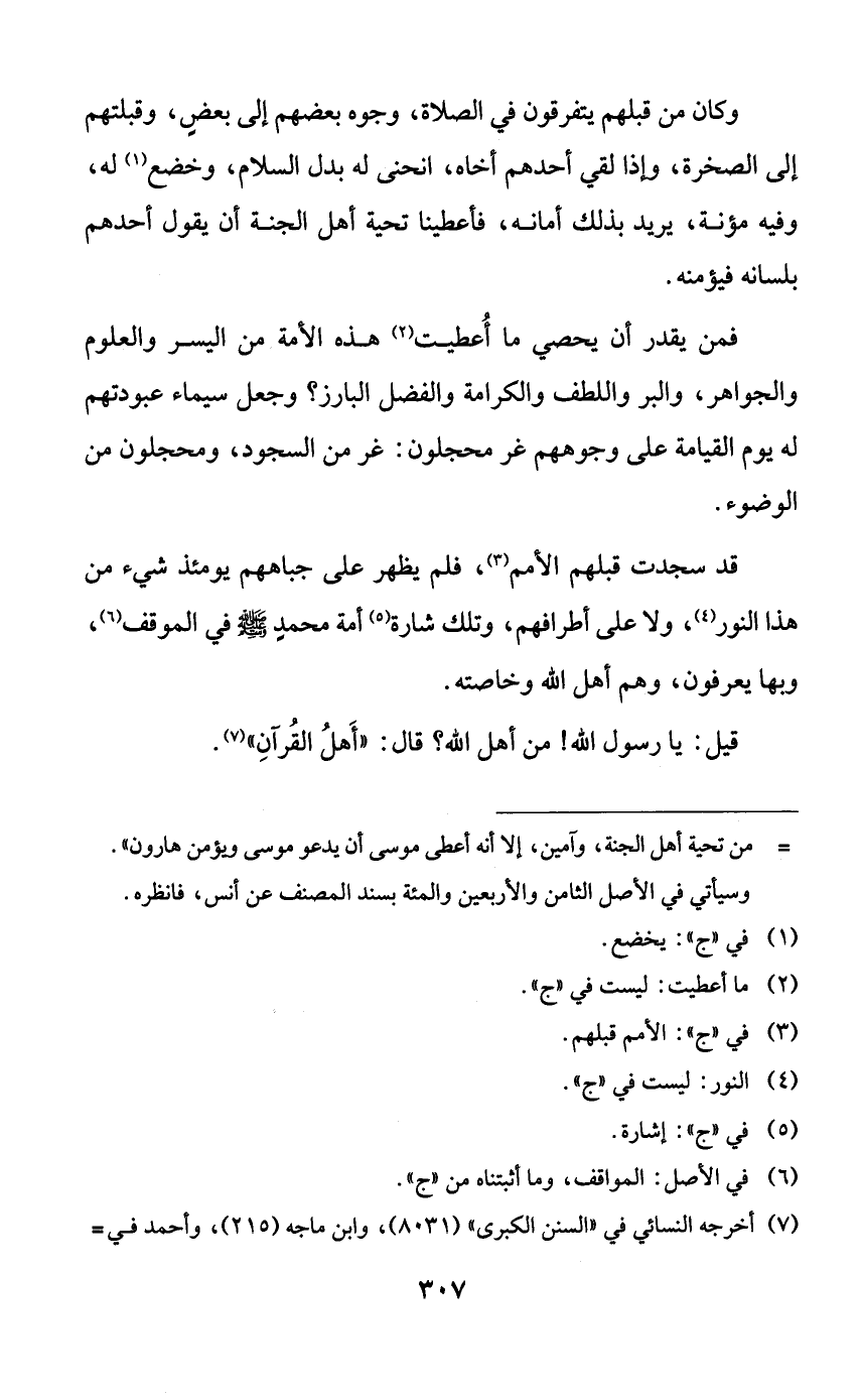 فمن يقدر أن يحصي ما أعطيت هذه الأمة من اليسر والعلوم والجواهر، والبر واللطف والكرامة والفضل البارز؟ وجعل سيماء عبودتهم له يوم القيامة على وجوههم غر محجلون: غر من السجود، ومحجلون من الوضوء.