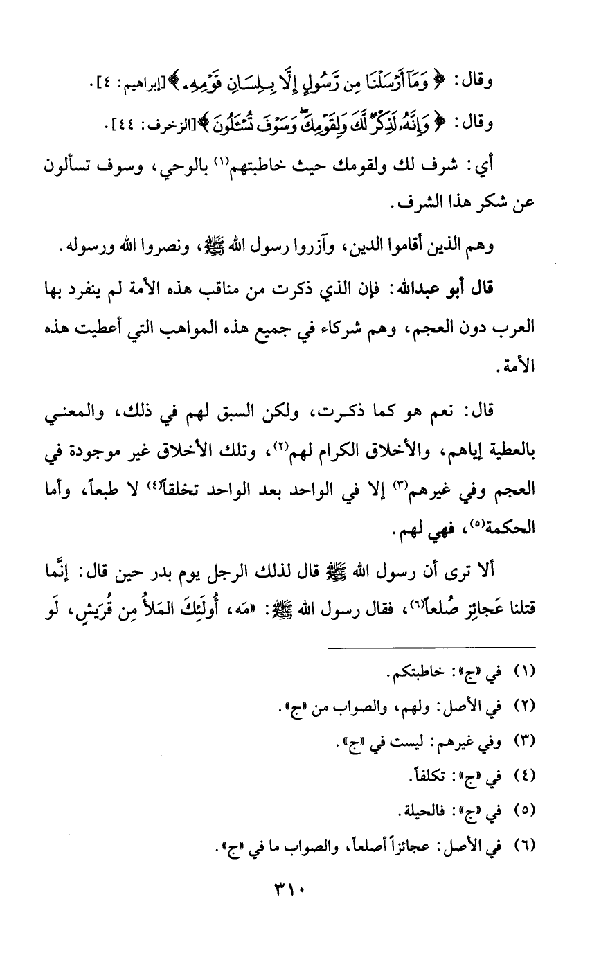 قال أبو عبد الله: فإن الذي ذكرت من مناقب هذه الأمة لم ينفرد بها العرب دون العجم، وهم شركاء في جميع هذه المواهب التي أعطيت هذه الأمة.