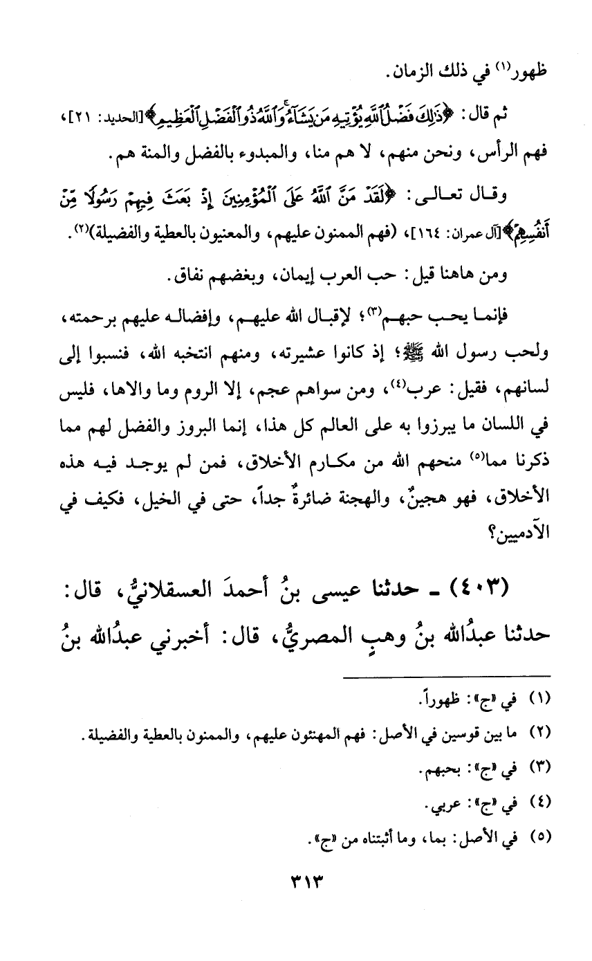 فإنما يحب حبهم؛ لإقبال الله عليهم، وإفضاله عليهم برحمته، ولحب رسول الله صلى الله عليه وسلم؛ إذ كانوا عشيرته، ومنهم انتخبه الله، فنسبوا إلى لسانهم، فقيل: عرب، ومن سواهم عجم، إلا الروم وما والاها، فليس في اللسان ما يبرزوا به على العالم كل هذا، إنما البروز والفضل لهم مما ذكرنا مما منحهم الله من مكارم الأخلاق، فمن لم يوجد فيه هذه الأخلاق، فهو هجينٌ، والهجنة ضائرةٌ جداً، حتى في الخيل، فكيف في الآدميين؟