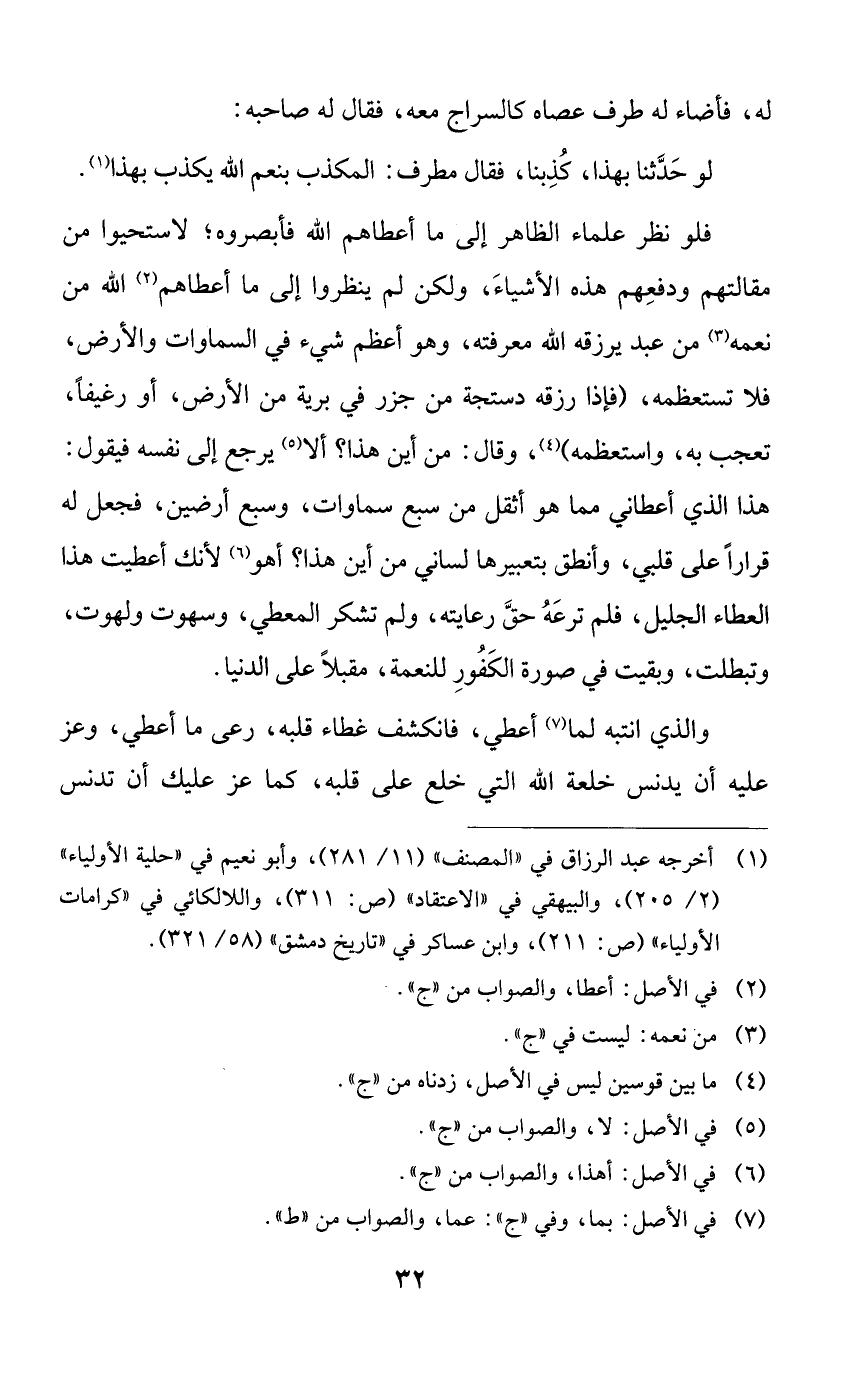 فلو نظر علماء الظاهر إلى ما أعطاهم الله فأبصروه؛ لاستحيوا من مقالتهم ودفعهم هذه الأشياء، ولكن لم ينظروا إلى ما أعطاهم الله من نعمه من عبد يرزقه الله معرفته، وهو أعظم في السماوات والأرض، فلا تستعظمه، (فإذا رزقه دستجة من جزر في برية من الأرض، أو رغيفاً، تعجب به، واستعظمه)، وقال: من أين هذا؟ ألا يرجع إلى نفسه فيقول: هذا الذي أعطاني مما هو أثقل من سبع سماوات، وسبع أرضين، فجعل له قراراً على قلبي، وأنطق بتعبيرها لساني من أين هذا؟ أهو لأنك أعطيت هذا العطاء الجليل، فلم ترعه حق رعايته، ولم تشكر المعطي، وسهوت ولهوت، وتبطلت، وبقيت في صورة الكفور للنعمة، مقبلاً على الدنيا.
