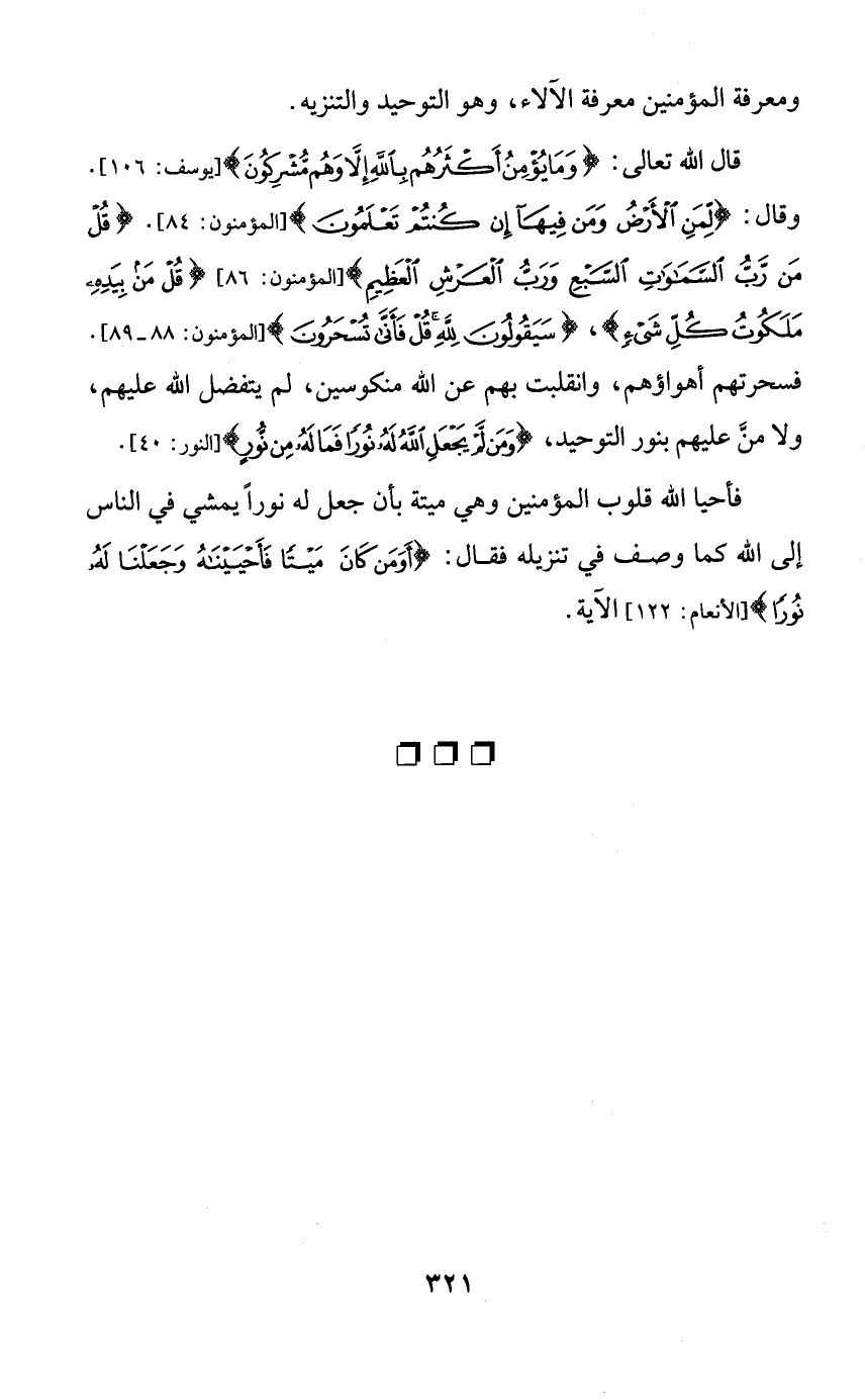 قال الله تعالى: {وما يؤمن أكثرهم بالله إلا وهم مشركون}. وقال: {لمن الأرض ومن فيها إن كنتم تعلمون}. {قل من رب السماوات السبع ورب العرش العظيم} {قل من بيده ملكوت كل شيءٍ}، {سيقولون لله قل فأنى تسحرون}. فسحرتهم أهواؤهم، وانقلبت بهم عن الله منكوسين، لم يتفضل الله عليهم، ولا من عليهم بنور التوحيد، {ومن لم يجعل الله له نوراً فما له من نورٍ}.