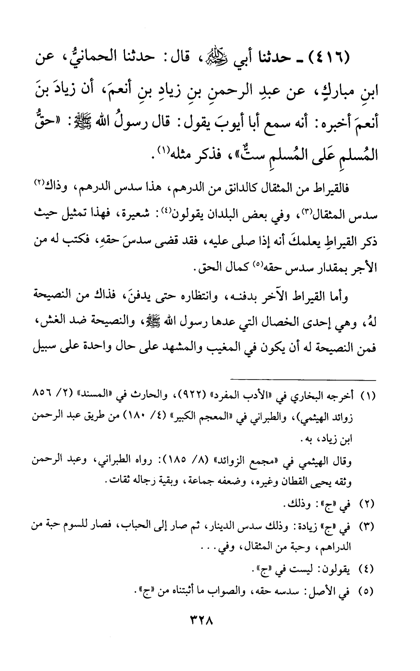 416 - حدثنا أبي رحمه الله، قال: حدثنا الحماني، عن ابن مباركٍ، عن عبد الرحمن بن زياد بن أنعم، أن زياد بن أنعم أخبره: أنه سمع أبا أيوب يقول: قال رسول الله صلى الله عليه وسلم: ((حق المسلم على المسلم ستٌّ))، فذكر مثله.