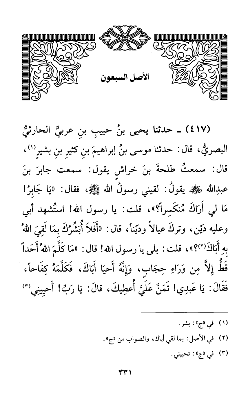 417 - حدثنا يحيى بن حبيب بن عربي الحارثي البصري، قال: حدثنا موسى بن إبراهيم بن كثير بن بشيرٍ، قال: سمعت طلحة بن خراشٍ يقول: سمعت جابر بن عبد الله رضي الله عنه يقول: لقيني رسول الله صلى الله عليه وسلم، فقال: ((يا جابر! ما لي أراك منكسراً؟))، قلت: يا رسول الله! استشهد أبي وعليه دين، وترك عيالاً وديناً، قال: ((أفلا أبشرك بما لقي الله به أباك؟))، قلت: بلى يا رسول الله! قال: ((ما كلم الله أحداً قط إلا من وراء حجابٍ، وإنه أحيا أباك، فكلمه كفاحاً، فقال: يا عبدي! تمن علي أعطيك، قال: يا ربّ أحييني
