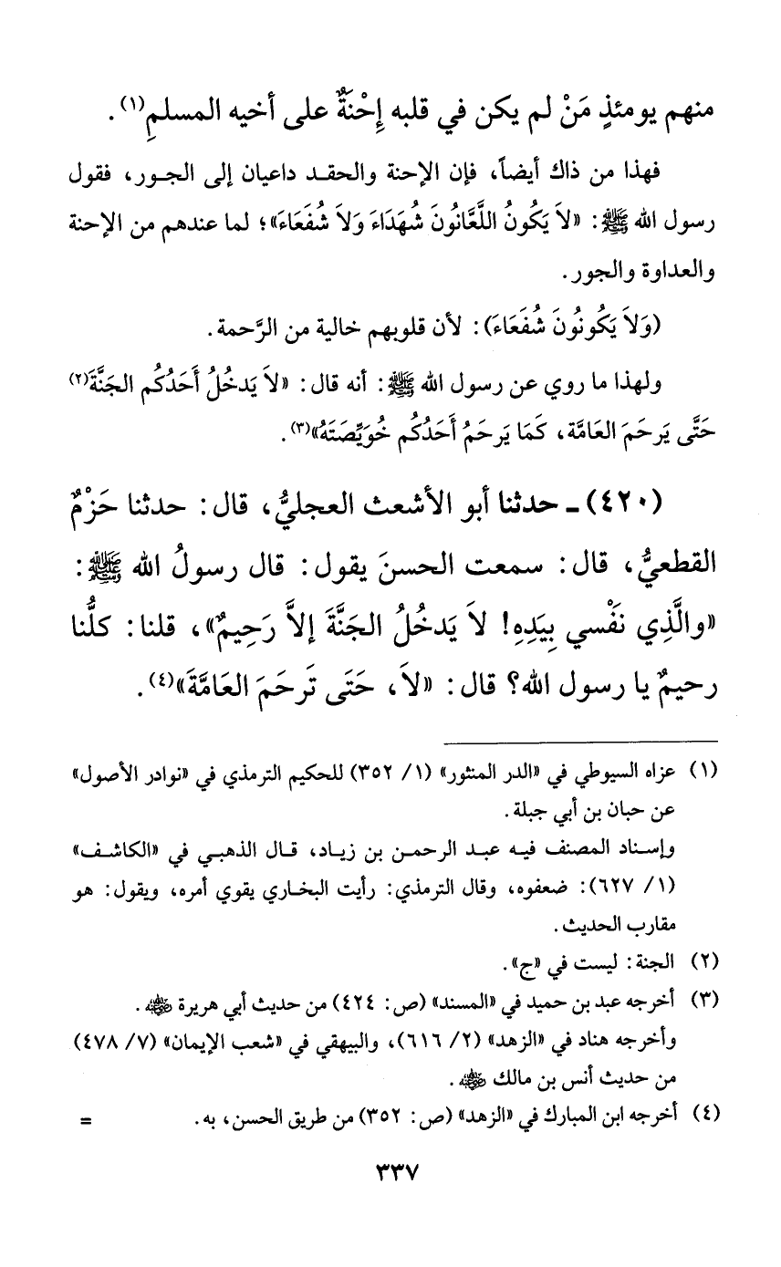 420 - حدثنا أبو الأشعث العجلي، قال: حدثنا حزمٌ القطعي، قال: سمعت الحسن يقول: قال رسول الله صلى الله عليه وسلم: ((والذي نفسي بيده! لا يدخل الجنة إلا رحيمٌ))، قلنا: كلنا رحيمٌ يا رسول الله؟ قال: ((لا، حتى ترحم العامة)).