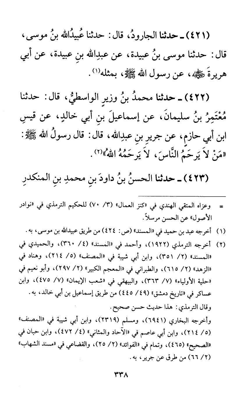 422 - حدثنا محمد بن وزيرٍ الواسطي، قال: حدثنا معتمر بن سليمان، عن إسماعيل بن أبي خالدٍ، عن قيس ابن أبي حازمٍ، عن جرير بن عبد الله، قال: قال رسول الله صلى الله عليه وسلم: ((من لا يرحم الناس، لا يرحمه الله)).