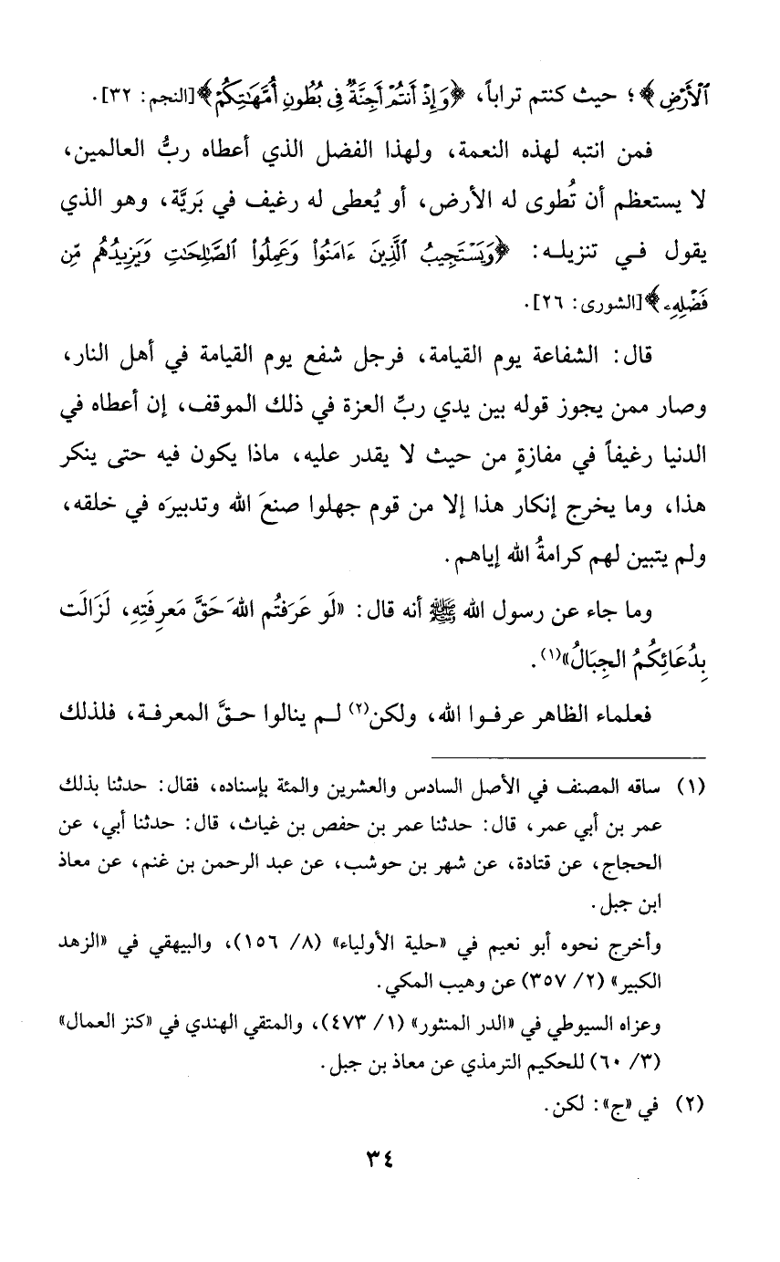 قال: الشفاعة يوم القيامة، فرجل شفع يوم القيامة في أهل النار، وصار ممن يجوز قوله بين يدي رب العزة في ذلك الموقف، إن أعطاه في الدنيا رغيفاً في مفازةٍ من حيث لا يقدر عليه، ماذا يكون فيه حتى ينكر هذا، وما يخرج إنكار هذا إلا من قوم جهلوا صنع الله وتدبيره في خلقه، ولم يتبين لهم كرامة الله إياهم.