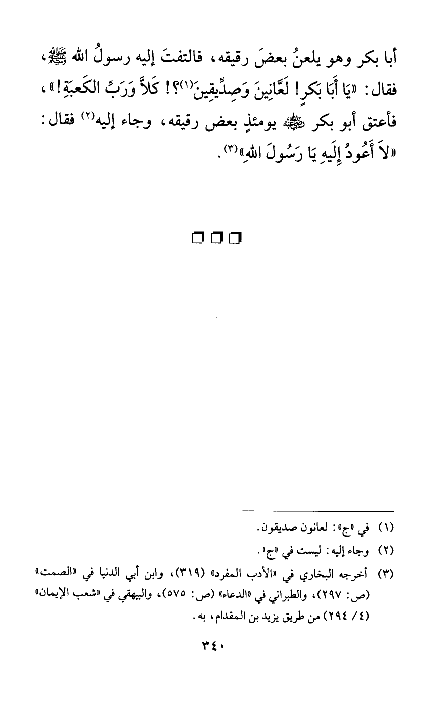 أبا بكر وهو يلعن بعض رقيقه، فالتفت إليه رسول الله صلى الله عليه وسلم، فقال: ((يا أبا بكرٍ! لعانين وصديقين؟! كلا ورب الكعبة!))، فأعتق أبو بكر رضي الله عنه يومئذٍ بعض رقيقه، وجاء إليه فقال: ((لا أعود إليه يا رسول الله)).