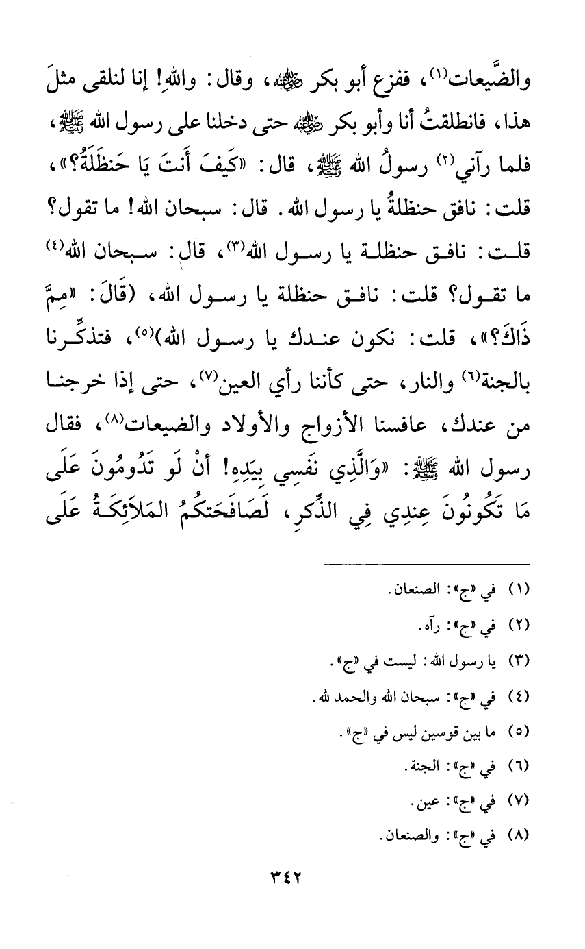 والضيعات، ففزع أبو بكر رضي الله عنه، وقال: والله! إنا لنلقى مثل هذا، فانطلقت أنا وأبو بكر رضي الله عنه حتى دخلنا على رسول الله صلى الله عليه وسلم، فلما رآني رسول الله صلى الله عليه وسلم، قال: ((كيف أنت يا حنظلة؟))، قلت: نافق حنظلة يا رسول الله. قال: سبحان الله! ما تقول؟ قلت: نافق حنظلة يا رسول الله، قال: سبحان الله ما تقول؟ قلت: نافق حنظلة يا رسول الله، (قال: ((مم ذاك؟))، قلت: نكون عندك يا رسول الله)، فتذكرنا بالجنة والنار، حتى كأننا رأي العين، حتى إذا خرجنا من عندك، عافسنا الأزواج والأولاد والضيعات، فقال رسول الله صلى الله عليه وسلم: ((والذي نفسي بيده! أن لو تدومون على ما تكونون عندي في الذكر، لصافحتكم الملائكة على