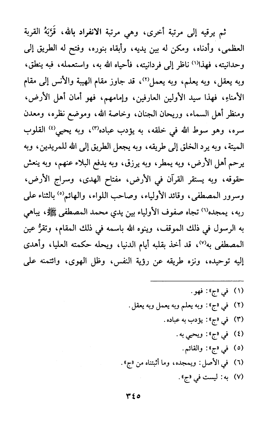 ثم يرقيه إلى مرتبة أخرى، وهي مرتبة الانفراد بالله، قربه القربة العظمى، وأدناه، ومكن له بين يديه، وأبقاه بنوره، وفتح له الطريق إلى وحدانيته، فهذا ناظر إلى فردانيته، فأحياه الله به، واستعمله، فبه ينطق، وبه يعقل، وبه يعلم، وبه يعمل، قد جاوز مقام الهيبة والأنس إلى مقام الأمناء، فهذا سيد الأولين العارفين، وإمامهم، فهو أمان أهل الأرض، ومنظر أهل السماء، وريحان الجنان، وخاصة الله، وموضع نظره، ومعدن سره، وهو سوط الله في خلقه، به يؤدب عباده، وبه يحيي القلوب الميتة، وبه يرد الخلق إلى طريقه، وبه يجعل الطريق إلى الله للمريدين، وبه يرحم أهل الأرض، وبه يمطر، وبه يرزق، وبه يدفع البلاء عنهم، وبه ينعش حقوقه، وبه يستقر القرآن في الأرض، مفتاح الهدى، وسراج الأرض، وسرور المصطفى، وقائد الأولياء، وصاحب اللواء، والهائم بالثناء على ربه، يمجده تجاه صفوف الأولياء بين يدي محمد المصطفى صلى الله عليه وسلم، يباهي به الرسول في ذلك الموقف، وينوه الله باسمه في ذلك المقام، وتقر عين المصطفى به، قد أخذ بقلبه أيام الدنيا، ويحله حكمته العليا، وأهدى إليه توحيده، ونزه طريقه عن رؤية النفس، وظل الهوى، وائتمنه على