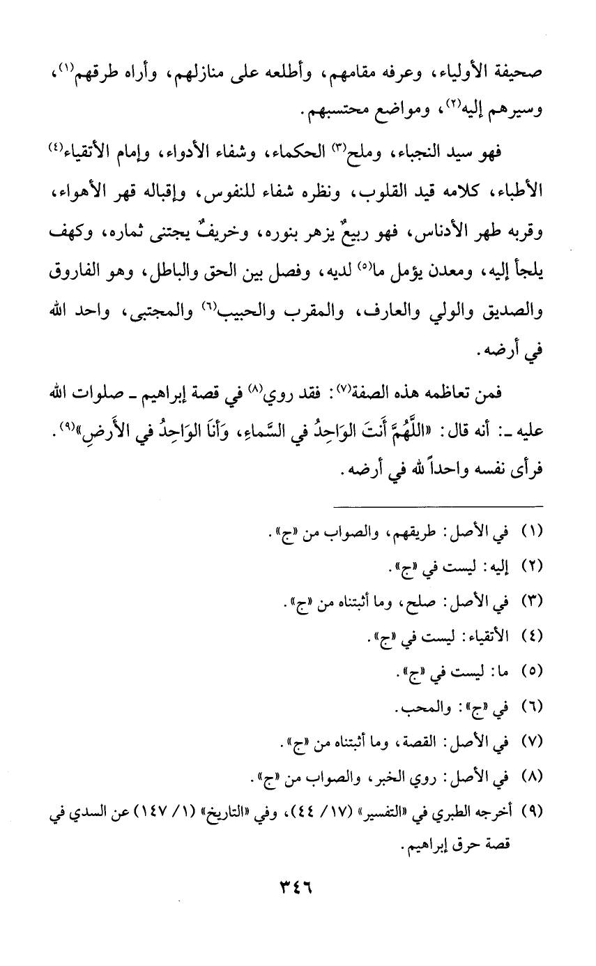 فهو سيد النجباء، وملح الحكماء، وشفاء الأدواء، وإمام الأتقياء الأطباء، كلامه قيد القلوب، ونظره شفاء للنفوس، وإقباله قهر الأهواء، وقربه طهر الأدناس، فهو ربيعٌ يزهر بنوره، وخريفٌ يجتنى ثماره، وكهف يلجأ إليه، ومعدن يؤمل ما لديه، وفصل بين الحق والباطل، وهو الفاروق والصديق والولي والعارف، والمقرب والحبيب والمجتبى، واحد الله في أرضه.