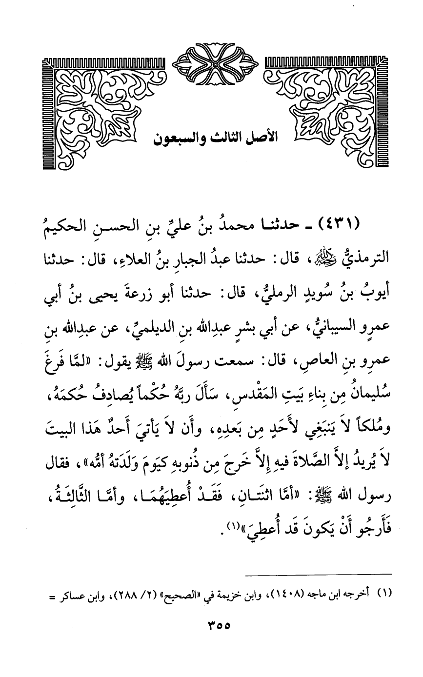 431 - حدثنا محمد بن علي بن الحسن الحكيم الترمذي رحمه الله، قال: حدثنا عبد الجبار بن العلاء، قال: حدثنا أيوب بن سويدٍ الرملي، قال: حدثنا أبو زرعة يحيى بن أبي عمرٍو السيباني، عن أبي بشرٍ عبد الله بن الديلمي، عن عبد الله بن عمرٍو بن العاص، قال: سمعت رسول الله صلى الله عليه وسلم يقول: ((لما فرغ سليمان من بناء بيت المقدس، سأل ربه حكماً يصادف حكمه، وملكاً لا ينبغي لأحدٍ من بعده، وأن لا يأتي أحدٌ هذا البيت لا يريد إلا الصلاة فيه إلا خرج من ذنوبه كيوم ولدته أمه))، فقال رسول الله صلى الله عليه وسلم: ((أما اثنتان، فقد أعطيهما، وأما الثالثة، فأرجو أن يكون قد أعطي)).