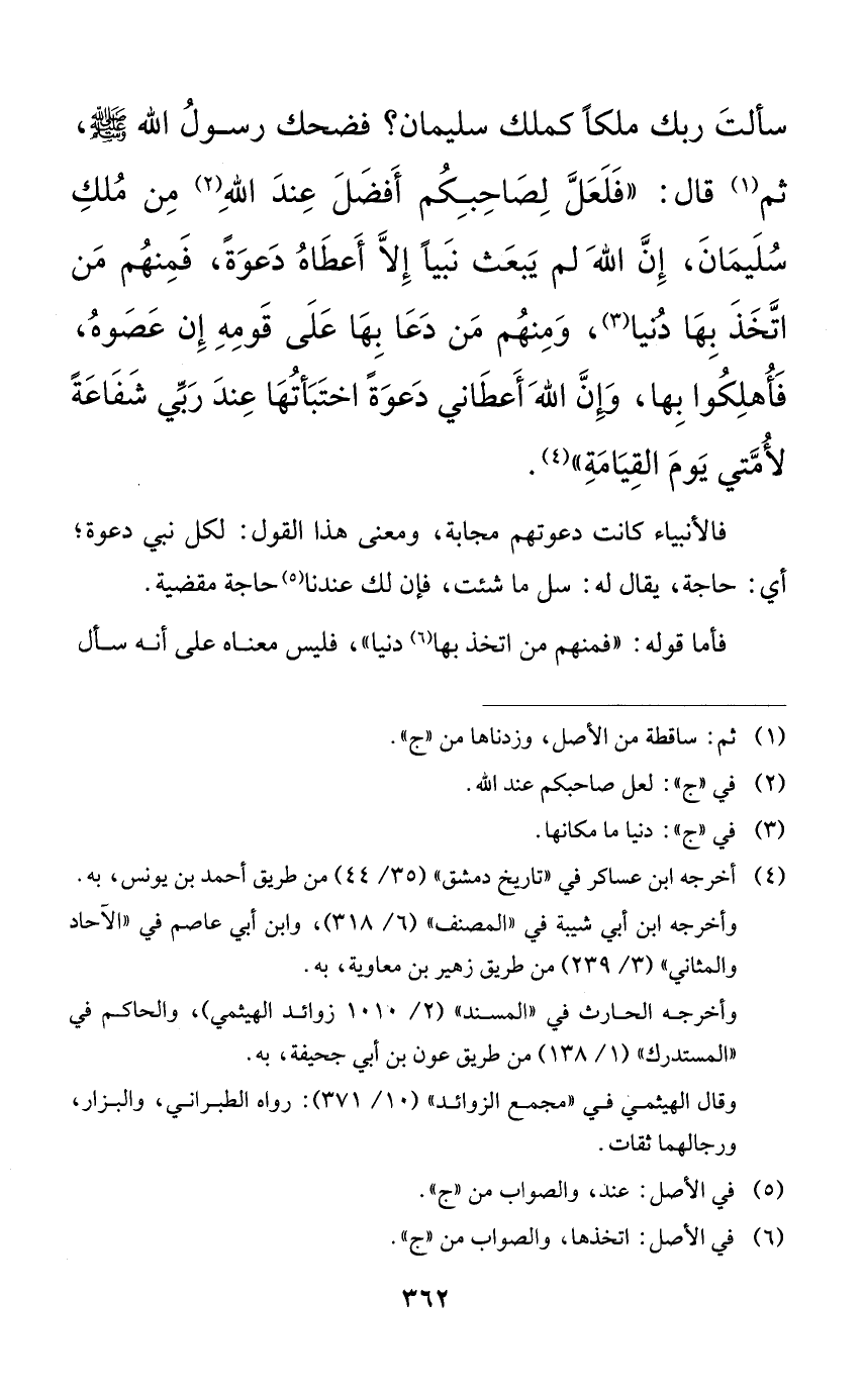 سألت ربك ملكاً كملك سليمان؟ فضحك رسول الله صلى الله عليه وسلم، ثم قال: ((فلعل لصاحبكم أفضل عند الله من ملك سليمان، إن الله لم يبعث نبياً إلا أعطاه دعوةً، فمنهم من اتخذ بها دنيا، ومنهم من دعا بها على قومه إن عصوه، فأهلكوا بها، وإن الله أعطاني دعوةً اختبأتها عند ربي شفاعةً لأمتي يوم القيامة)).