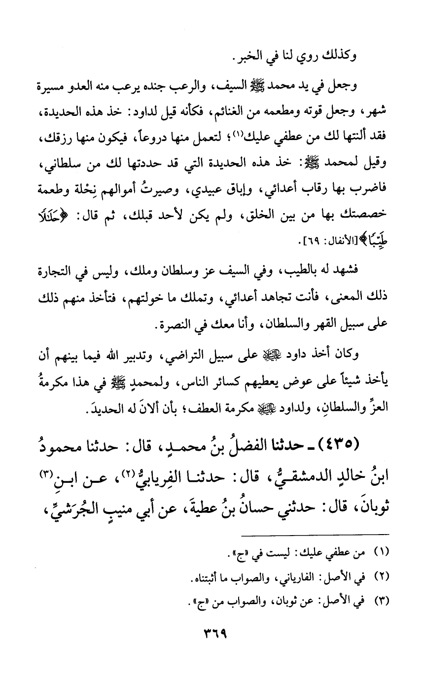 وجعل في يد محمد صلى الله عليه وسلم السيف، والرعب جنده يرعب منه العدو مسيرة شهر، وجعل قوته ومطعمه من الغنائم، فكأنه قيل لداود: خذ هذه الحديدة، فقد ألنتها لك من عطفي عليك؛ لتعمل منها دروعاً، فيكون منها رزقك، وقيل لمحمد صلى الله عليه وسلم: خذ هذه الحديدة التي قد حددتها لك من سلطاني، فاضرب بها رقاب أعدائي، وإباق عبيدي، وصيرت أموالهم نحلة وطعمة خصصتك بها من بين الخلق، ولم يكن لأحد قبلك، ثم قال: {حلالاً طيباً}.
