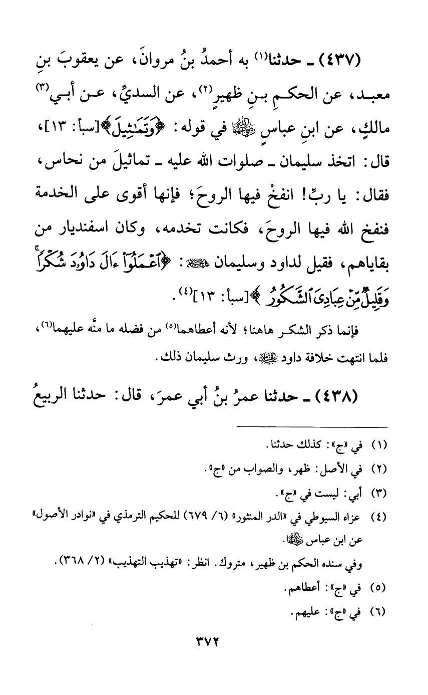 437 - حدثنا به أحمد بن مروان، عن يعقوب بن معبد، عن الحكم بن ظهيرٍ، عن السدي، عن أبي مالكٍ، عن ابن عباسٍ رضي الله عنهما في قوله: {وتماثيل}، قال: اتخذ سليمان -صلوات الله عليه- تماثيل من نحاس، فقال: يا رب! انفخ فيها الروح؛ فإنها أقوى على الخدمة فنفخ الله فيها الروح، فكانت تخدمه، وكان اسفنديار من بقاياهم، فقيل لداود وسليمان عليهما السلام: {اعملوا آل داود شكراً وقليلٌ من عبادي الشكور}.
