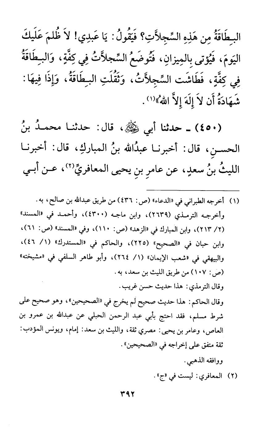450 - حدثنا أبي رحمه الله، قال: حدثنا محمد بن الحسين، قال: أخبرنا عبد الله بن المبارك، قال: أخبرنا الليث بن سعدٍ، عن عامر بن يحيى المعافري، عن أبي
